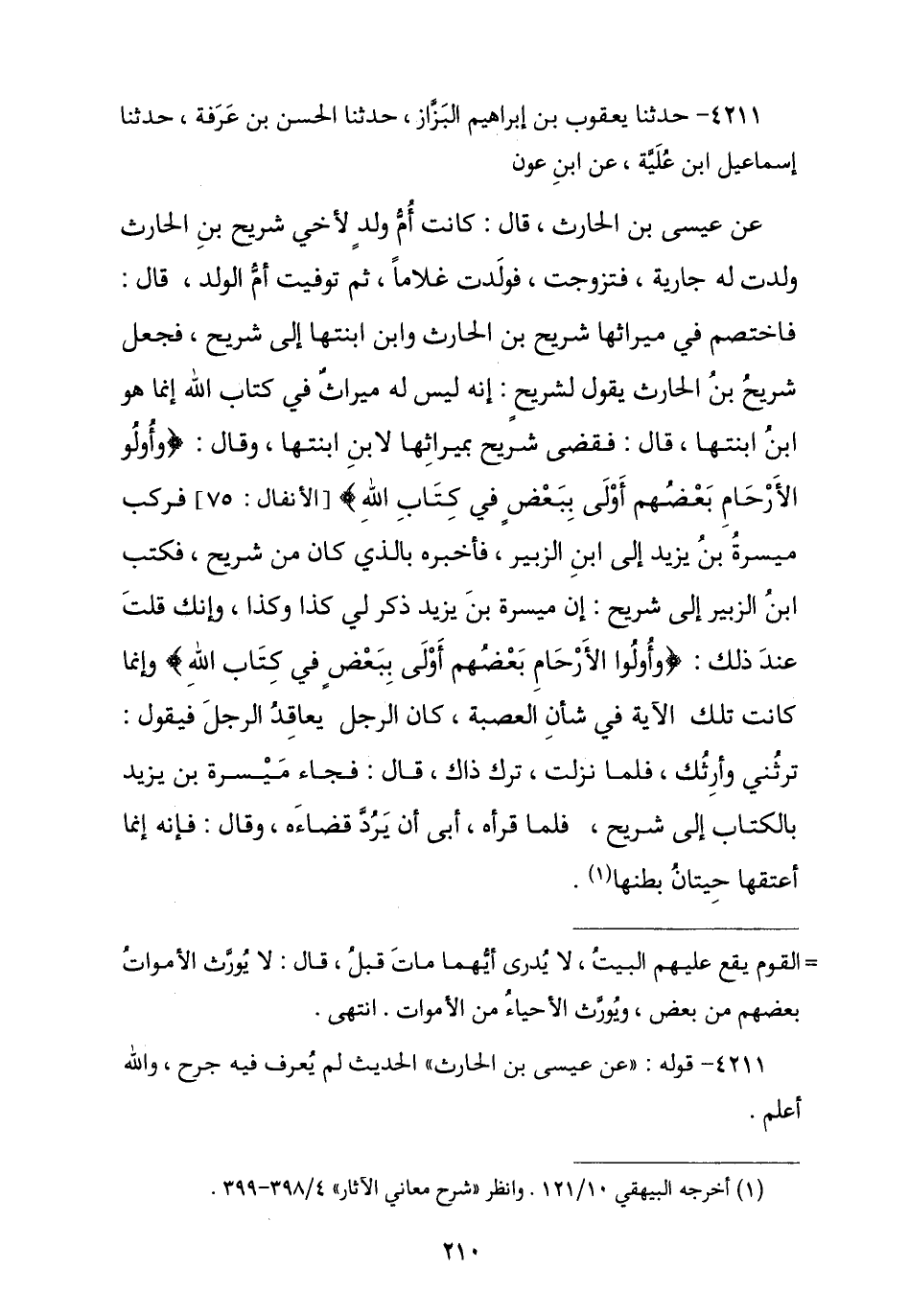 4211 - نا يَعْقُوبُ بْنُ إِبْرَاهِيمَ الْبَزَّازُ , نا الْحَسَنُ بْنُ عَرَفَةَ , نا إِسْمَاعِيلُ ابْنُ عُلَيَّةَ , عَنِ ابْنِ عَوْنٍ , عَنْ عِيسَى بْنِ الْحَارِثِ , قَالَ: كَانَتْ أُمُّ وَلَدٍ لِأَخِي شُرَيْحِ بْنِ الْحَارِثِ وَلَدَتْ لَهُ جَارِيَةً فَزُوِّجَتْ فَوَلَدَتْ غُلَامًا ثُمَّ تُوُفِّيَتْ أُمُّ الْوَلَدِ , قَالَ: فَاخْتَصَمَ فِي مِيرَاثَهَا شُرَيْحُ بْنُ الْحَارِثِ وَابْنُ ابْنَتِهَا إِلَى شُرَيْحٍ , فَجَعَلَ شُرَيْحُ بْنُ الْحَارِثِ يَقُولُ لِشُرَيْحٍ: إِنَّهُ لَيْسَ لَهُ مِيرَاثٌ فِي كِتَابِ اللَّهِ إِنَّمَا هُوَ ابْنُ ابْنَتِهَا , قَالَ: فَقَضَى شُرَيْحٌ بِمِيرَاثِهَا لِابْنِ ابْنَتِهَا , وَقَالَ {وَأُولُو الْأَرْحَامِ بَعْضُهُمْ أَوْلَى بِبَعْضٍ فِي كِتَابِ اللَّهِ} [الأحزاب: 6] , فَرَكِبَ مَيْسَرَةُ بْنُ يَزِيدَ إِلَى ابْنِ الزُّبَيْرِ فَأَخْبَرَهُ بِالَّذِي كَانَ مِنْ شُرَيْحٍ , فَكَتَبَ ابْنُ الزُّبَيْرِ إِلَى شُرَيْحٍ: إِنَّ مَيْسَرَةَ بْنَ يَزِيدَ ذَكَرَ لِي كَذَا وَكَذَا وَإِنَّكَ قُلْتَ عِنْدَ ذَلِكَ {وَأُولُو الْأَرْحَامِ بَعْضُهُمْ أَوْلَى بِبَعْضٍ فِي كِتَابِ اللَّهِ} [الأحزاب: 6] , وَإِنَّمَا كَانَتْ تِلْكَ الْآيَةُ فِي شَأْنِ الْعَصَبَةِ كَانَ الرَّجُلُ يُعَاقِدُ الرَّجُلَ , فَيَقُولُ: تَرِثُنِي وَأَرِثُكَ فَلَمَّا نَزَلَتْ تُرِكَ ذَاكَ , فَجَاءَ مَيْسَرَةُ بْنُ يَزِيدَ بِالْكِتَابِ إِلَى شُرَيْحٍ , فَلَمَّا قَرَأَهُ أَبَى أَنْ يَرُدَّ قَضَاءَهُ , وَقَالَ: «فَإِنَّهُ إِنَّمَا §أَعْتَقَهَا خَبَيَاتِ بَطْنِهَا»