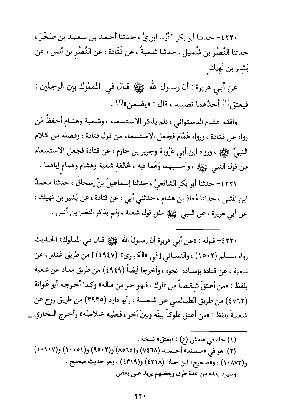 4220 - حَدَّثَنَا أَبُو بَكْرٍ النَّيْسَابُورِيُّ , نا أَحْمَدُ بْنُ سَعِيدِ بْنِ صَخْرٍ , نا النَّضْرُ بْنُ شُمَيْلٍ , نا شُعْبَةُ , عَنْ قَتَادَةَ , عَنِ النَّضْرِ بْنِ أَنَسٍ , عَنْ بَشِيرِ بْنِ نَهِيكٍ , عَنْ أَبِي هُرَيْرَةَ , أَنَّ رَسُولَ اللَّهِ صَلَّى اللهُ عَلَيْهِ وَسَلَّمَ قَالَ فِي الْمَمْلُوكِ بَيْنَ الرَّجُلَيْنِ يُعْتِقُ أَحَدُهُمَا نَصِيبَهُ , قَالَ: § «يَضْمَنُ». وَافَقَهُ هِشَامٌ الدَّسْتُوَائِيُّ فَلَمْ يَذْكُرِ الِاسْتِسْعَاءَ , وَشُعْبَةُ وَهِشَامٌ أَحْفَظُ مَنْ رَوَاهُ عَنْ قَتَادَةَ. وَرَوَاهُ هَمَّامٌ فَجَعَلَ الِاسْتِسْعَاءَ مِنْ قَوْلِ قَتَادَةَ , وَفَصَلَهُ مِنْ كَلَامِ النَّبِيِّ صَلَّى اللهُ عَلَيْهِ وَسَلَّمَ. وَرَوَاهُ ابْنُ أَبِي عَرُوبَةَ , وَجَرِيرُ بْنُ حَازِمٍ , عَنْ قَتَادَةَ , فَجَعَلَ الِاسْتِسْعَاءَ مِنْ قَوْلِ النَّبِيِّ صَلَّى اللهُ عَلَيْهِ وَسَلَّمَ. وَأَحْسَبُهُمَا وَهِمَا فِيهِ لِمُخَالَفَةِ شُعْبَةَ , وَهِشَامٍ , وَهَمَّامٍ إِيَّاهُمَا.