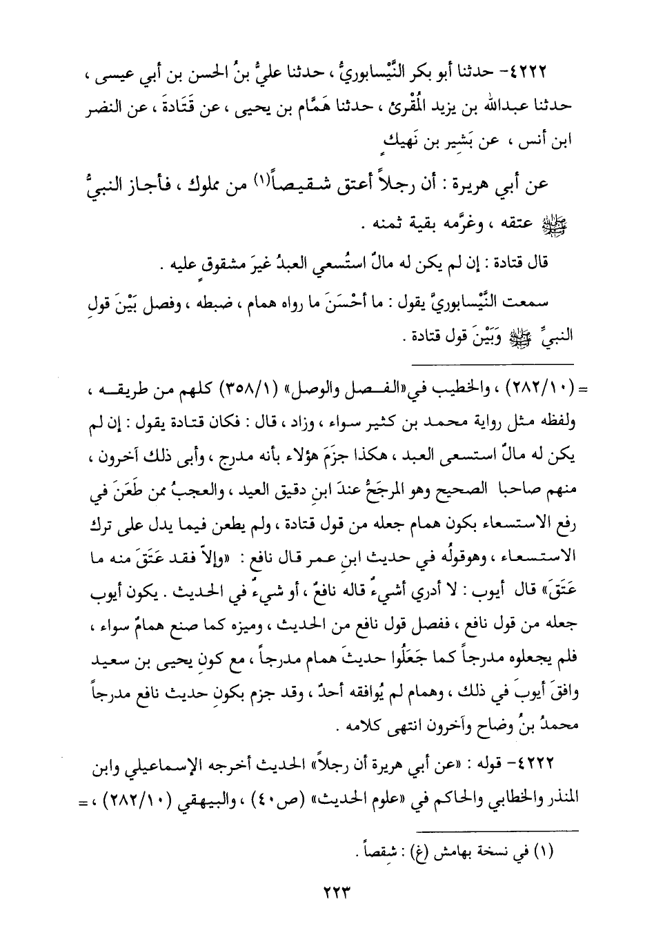 4222 - حَدَّثَنَا أَبُو بَكْرٍ النَّيْسَابُورِيُّ , نا عَلِيُّ بْنُ الْحَسَنِ بْنِ أَبِي عِيسَى , نا عَبْدُ اللَّهِ بْنُ يَزِيدَ الْمُقْرِئُ , نا هَمَّامٌ , عَنْ قَتَادَةَ , عَنِ النَّضْرِ بْنِ أَنَسٍ , عَنْ بَشِيرِ بْنِ نَهِيكٍ , عَنْ أَبِي هُرَيْرَةَ , أَنَّ رَجُلًا أَعْتَقَ شِقْصًا مِنْ مَمْلُوكٍ «فَأَجَازَ النَّبِيُّ صَلَّى اللهُ عَلَيْهِ وَسَلَّمَ عِتْقَهُ §وَغَرَّمَهُ بَقِيَّةَ ثَمَنِهِ». قَالَ قَتَادَةُ: إِنْ لَمْ يَكُنْ لَهُ مَالٌ اسْتَسْعَى الْعَبْدُ غَيْرَ مَشْقُوقٍ عَلَيْهِ. سَمِعْتُ النَّيْسَابُورِيَّ يَقُولُ: مَا أَحْسَنَ مَا رَوَاهُ هَمَّامٌ وَضَبَطَهُ , وَفَصْلَ بَيْنَ قَوْلِ النَّبِيِّ صَلَّى اللهُ عَلَيْهِ وَسَلَّمَ وَبَيْنَ قَوْلِ قَتَادَةَ