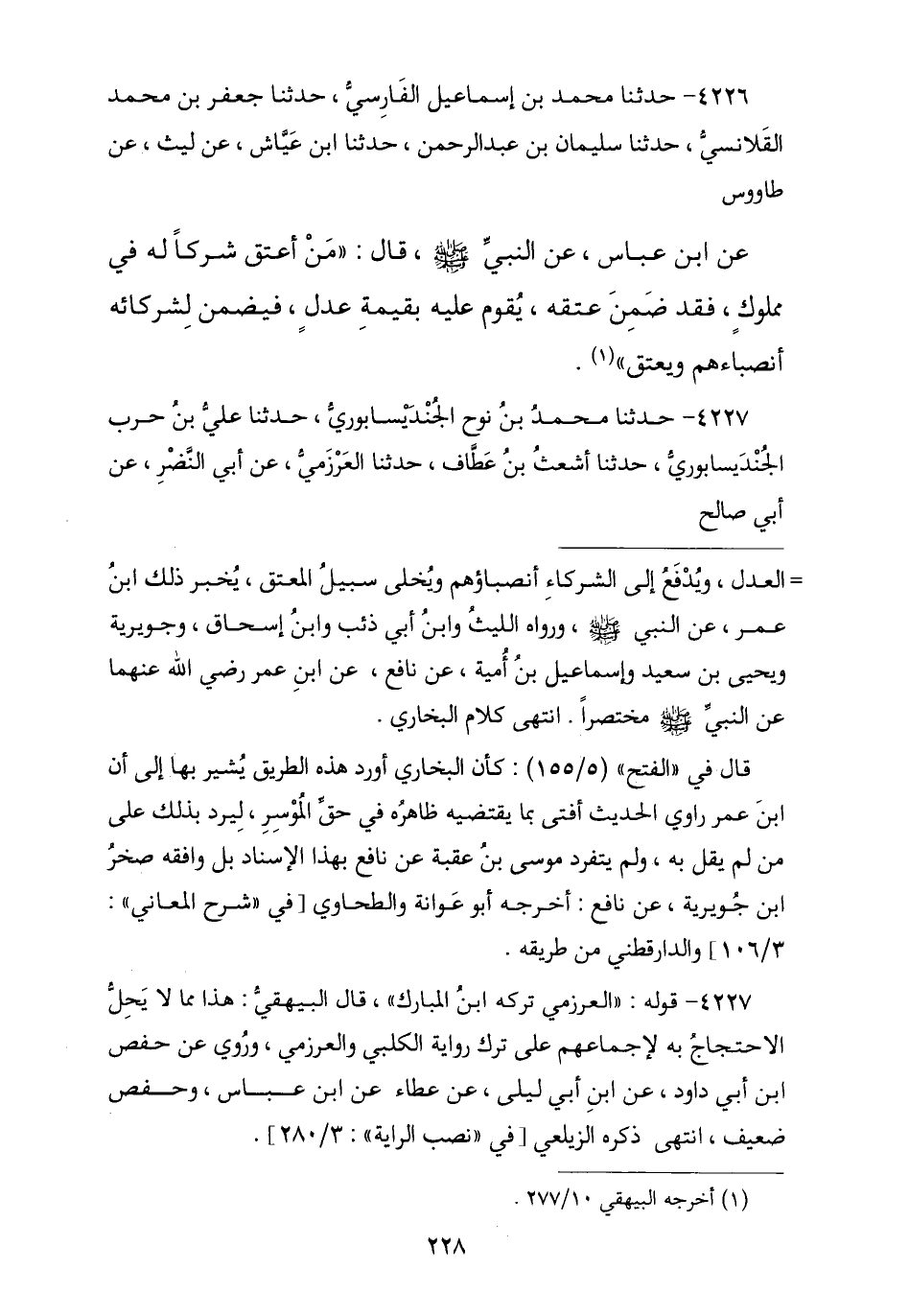 4226 - حَدَّثَنَا مُحَمَّدُ بْنُ إِسْمَاعِيلَ الْفَارِسِيُّ , نا جَعْفَرُ بْنُ مُحَمَّدٍ الْقَلَانِسِيُّ , نا سُلَيْمَانُ بْنُ عَبْدِ الرَّحْمَنِ , نا ابْنُ عَيَّاشٍ , عَنْ لَيْثٍ , عَنْ طَاوُسٍ , عَنِ ابْنِ عَبَّاسٍ , عَنِ النَّبِيِّ صَلَّى اللهُ عَلَيْهِ وَسَلَّمَ , قَالَ: § «مَنْ أَعْتَقَ شِرْكًا لَهُ فِي مَمْلُوكٍ فَقَدْ ضَمِنَ عِتْقَهُ يُقَوِّمُ عَلَيْهِ بِقِيمَةِ عَدْلٍ فَيَضْمَنُ لِشُرَكَائِهِ أَنْصِبَاءَهُمْ وَيَعْتِقُ»