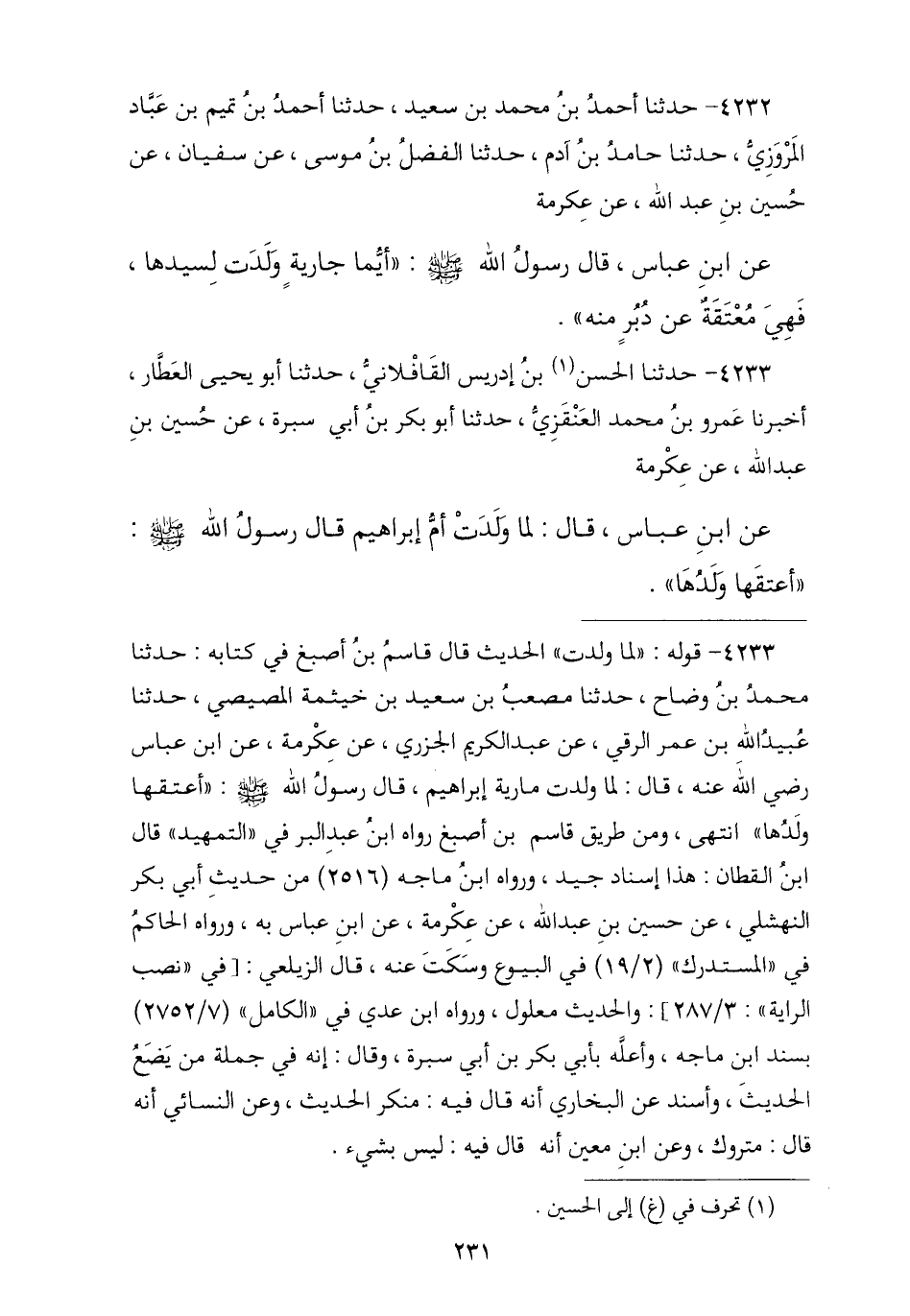 4233 - حَدَّثَنَا الْحُسَيْنُ بْنُ إِدْرِيسَ الْقَافَلَانِيُّ , نا أَبُو يَحْيَى الْعَطَّارُ , نا عَمْرُو بْنُ مُحَمَّدٍ الْعَنْقَزِيُّ , نا أَبُو بَكْرِ بْنُ أَبِي سَبْرَةَ , عَنْ حُسَيْنِ بْنِ عَبْدِ اللَّهِ , عَنْ عِكْرِمَةَ , عَنِ ابْنِ عَبَّاسٍ , قَالَ: لَمَّا وَلَدَتْ أُمُّ إِبْرَاهِيمَ , قَالَ: قَالَ رَسُولُ اللَّهِ صَلَّى اللهُ عَلَيْهِ وَسَلَّمَ: § «أَعْتَقَهَا وَلَدُهَا»