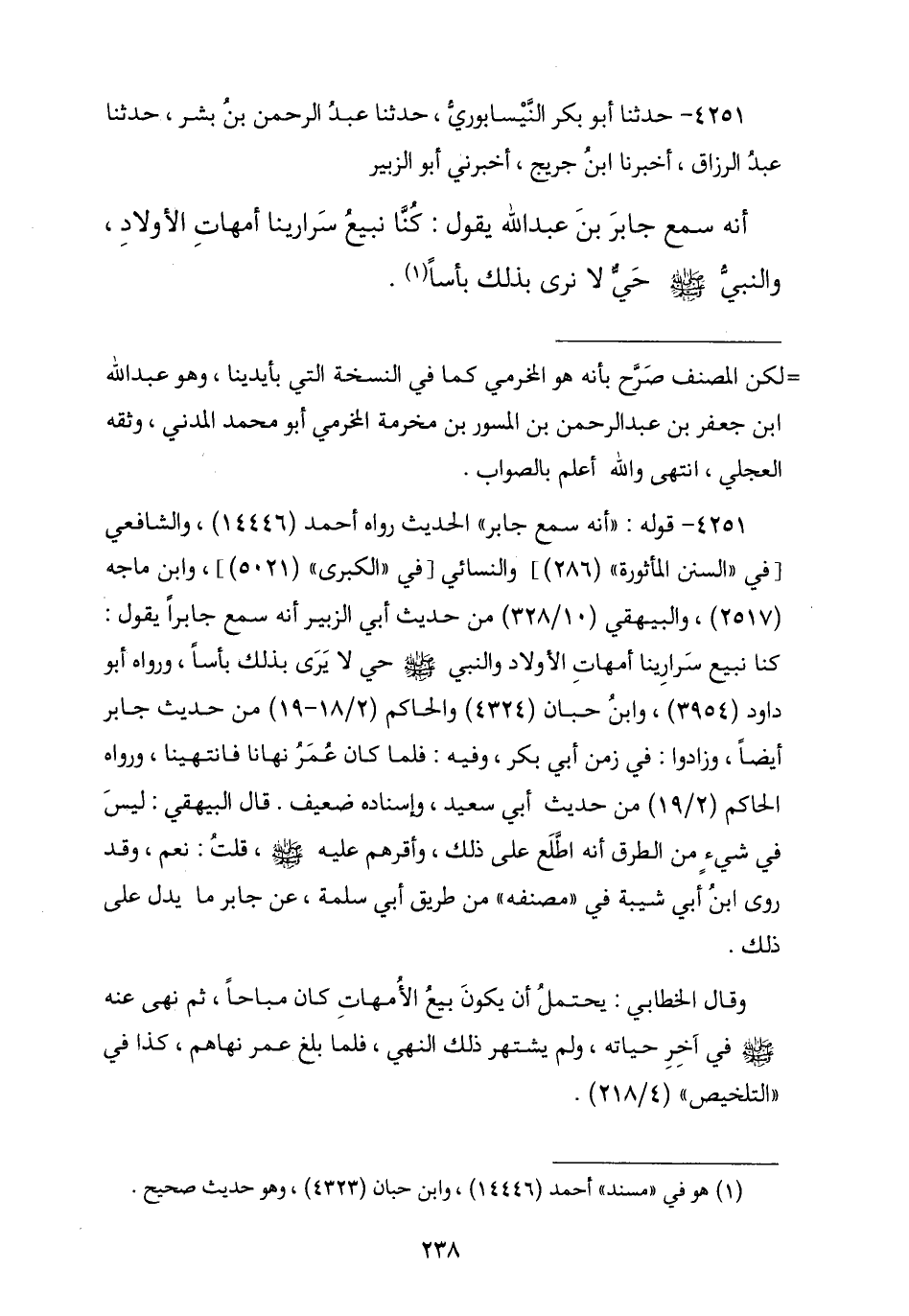 4251 - حَدَّثَنَا أَبُو بَكْرٍ النَّيْسَابُورِيُّ , نا عَبْدُ الرَّحْمَنِ بْنُ بِشْرٍ , نا عَبْدُ الرَّزَّاقِ , أنا ابْنُ جُرَيْجٍ , أَخْبَرَنِي أَبُو الزُّبَيْرِ , أَنَّهُ سَمِعَ جَابِرًا يَعْنِي ابْنَ عَبْدِ اللَّهِ , يَقُولُ: «كُنَّا §نَبِيعُ سَرَارِيَّنَا أُمَّهَاتِ الْأَوْلَادِ , وَالنَّبِيُّ صَلَّى اللهُ عَلَيْهِ وَسَلَّمَ حَيُّ لَا يَرَى بِذَلِكَ بَأْسًا»