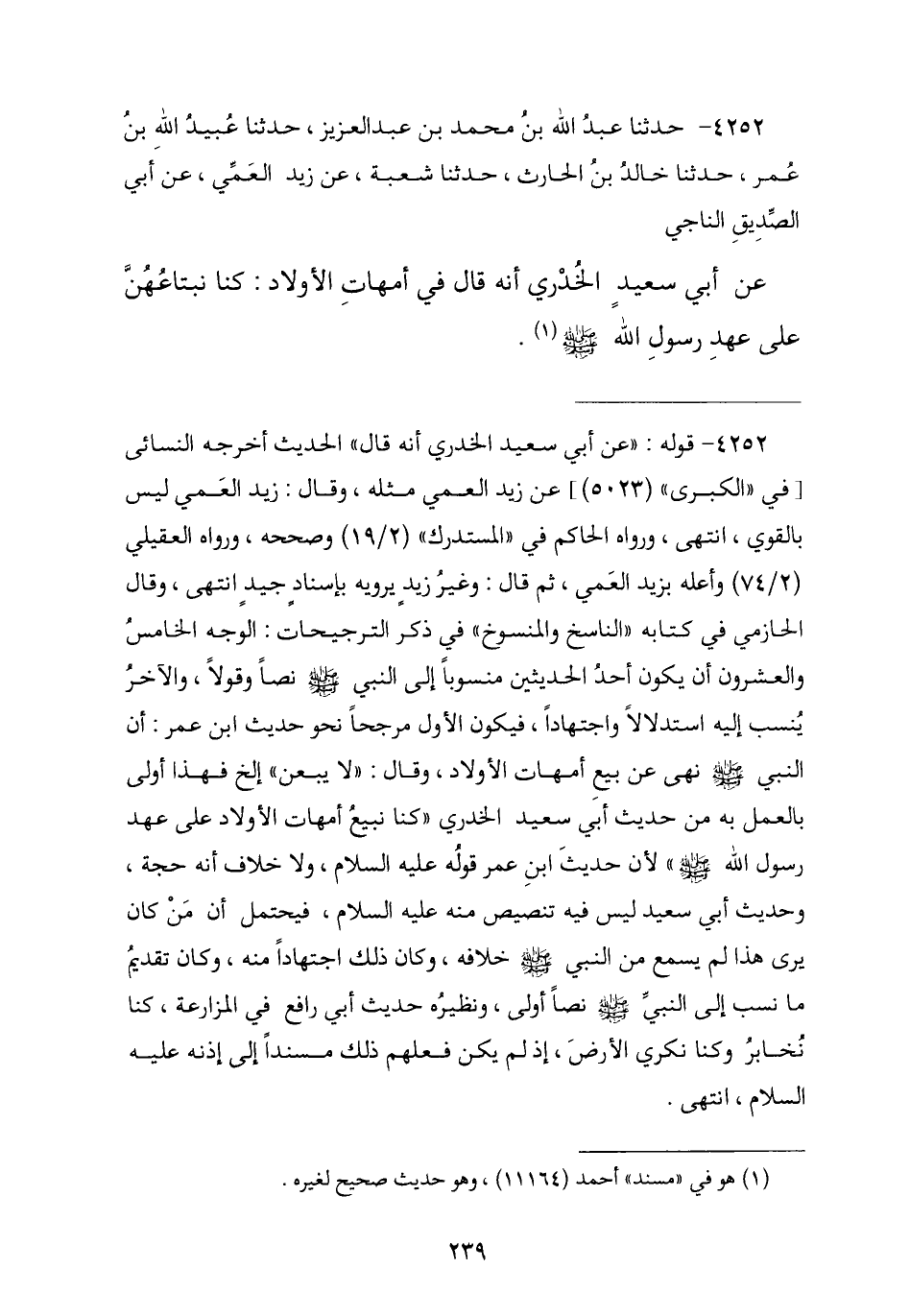 4252 - نا عَبْدُ اللَّهِ بْنُ مُحَمَّدِ بْنِ عَبْدِ الْعَزِيزِ , ثنا عُبَيْدُ اللَّهِ بْنُ عُمَرَ , نا خَالِدُ بْنُ الْحَارِثِ , نا شُعْبَةُ , عَنْ زَيْدٍ الْعَمِّيِّ , عَنْ أَبِي الصِّدِّيقِ النَّاجِيِّ , عَنْ أَبِي سَعِيدٍ الْخُدْرِيِّ , أَنَّهُ قَالَ فِي أُمَّهَاتِ الْأَوْلَادِ: «كُنَّا §نَبْتَاعَهُنَّ عَلَى عَهْدِ رَسُولِ اللَّهِ صَلَّى اللهُ عَلَيْهِ وَسَلَّمَ»