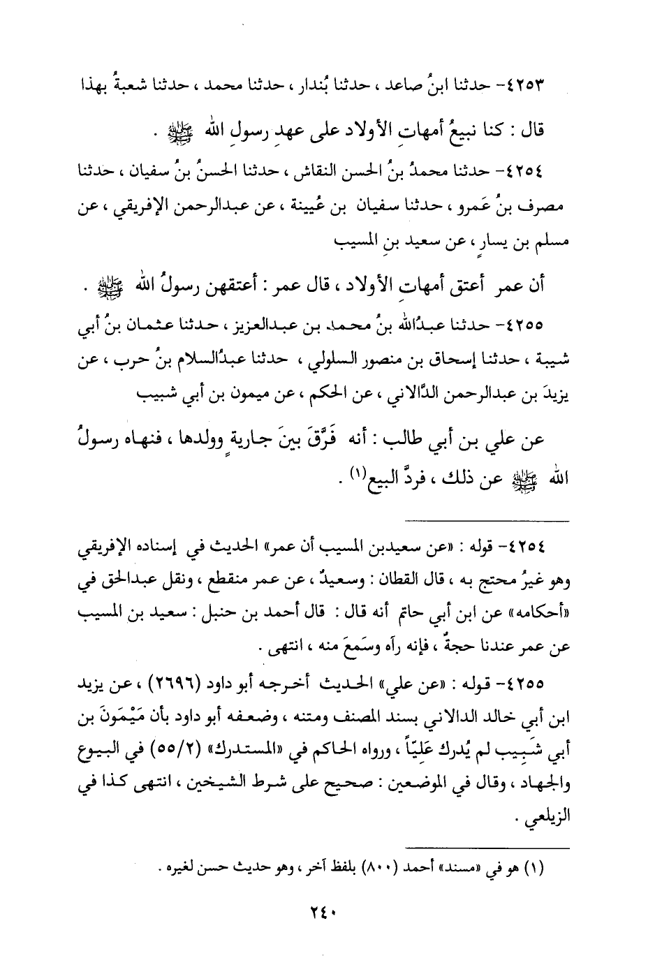 4254 - نا مُحَمَّدُ بْنُ الْحَسَنِ النَّقَّاشُ , ثنا الْحَسَنُ بْنُ سُفْيَانَ , نا مُصَرِّفُ بْنُ عَمْرٍو , نا سُفْيَانُ بْنُ عُيَيْنَةَ , عَنْ عَبْدِ الرَّحْمَنِ الْأَفْرِيقِيِّ , عَنْ مُسْلِمِ بْنِ يَسَارٍ , عَنْ سَعِيدِ بْنِ الْمُسَيِّبِ , أَنَّ عُمَرَ رَضِيَ اللَّهُ عَنْهُ §أَعْتَقَ أُمَّهَاتِ الْأَوْلَادِ , وَقَالَ عُمَرُ: «أَعْتَقَهُنَّ رَسُولُ اللَّهِ صَلَّى اللهُ عَلَيْهِ وَسَلَّمَ»