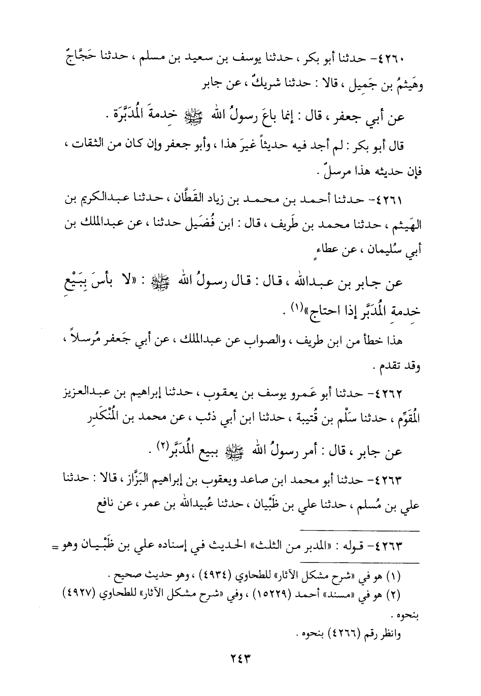 4262 - نا أَبُو عَمْرٍو يُوسُفُ بْنُ يَعْقُوبَ , نا إِبْرَاهِيمُ بْنُ عَبْدِ الْعَزِيزِ الْمُقَوِّمُ , ثنا سَلْمُ بْنُ قُتَيْبَةَ , نا ابْنُ أَبِي ذِئْبٍ , عَنْ مُحَمَّدِ بْنِ الْمُنْكَدِرِ , عَنْ جَابِرٍ , قَالَ: «أَمَرَ رَسُولُ اللَّهِ صَلَّى اللهُ عَلَيْهِ وَسَلَّمَ §بِبَيْعِ الْمُدَبَّرِ»