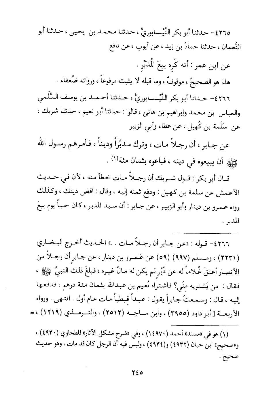 4265 - حَدَّثَنَا أَبُو بَكْرٍ النَّيْسَابُورِيُّ , نا مُحَمَّدُ بْنُ يَحْيَى , نا أَبُو النُّعْمَانِ , نا حَمَّادُ بْنُ زَيْدٍ , عَنْ أَيُّوبَ , عَنْ نَافِعٍ , عَنِ ابْنِ عُمَرَ «أَنَّهُ §كَرِهَ بَيْعَ الْمُدَبَّرِ». هَذَا هُوَ الصَّحِيحُ مَوْقُوفٌ , وَمَا قَبْلَهُ لَا يُثْبَتُ مَرْفُوعًا , وَرُوَاتُهُ ضُعَفَاءُ