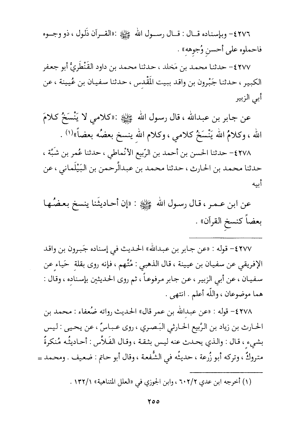 4277 - نا مُحَمَّدُ بْنُ مَخْلَدٍ , نا مُحَمَّدُ بْنُ دَاوُدَ الْقَنْطَرِيُّ أَبُو جَعْفَرٍ الْكَبِيرُ , نا جَبْرُونُ بْنُ وَاقِدٍ بِبَيْتِ الْمَقْدِسِ , نا سُفْيَانُ بْنُ عُيَيْنَةَ , عَنْ أَبِي الزُّبَيْرِ , عَنْ جَابِرِ بْنِ عَبْدِ اللَّهِ رَضِيَ اللَّهُ عَنْهُمَا , قَالَ: قَالَ رَسُولُ اللَّهِ صَلَّى اللهُ عَلَيْهِ وَسَلَّمَ: § «كَلَامِي لَا يَنْسَخُ كَلَامَ اللَّهِ وَكَلَامُ اللَّهِ , يَنْسَخُ كَلَامِي وَكَلَامُ اللَّهِ , يَنْسَخُ بَعْضُهُ بَعْضًا»
