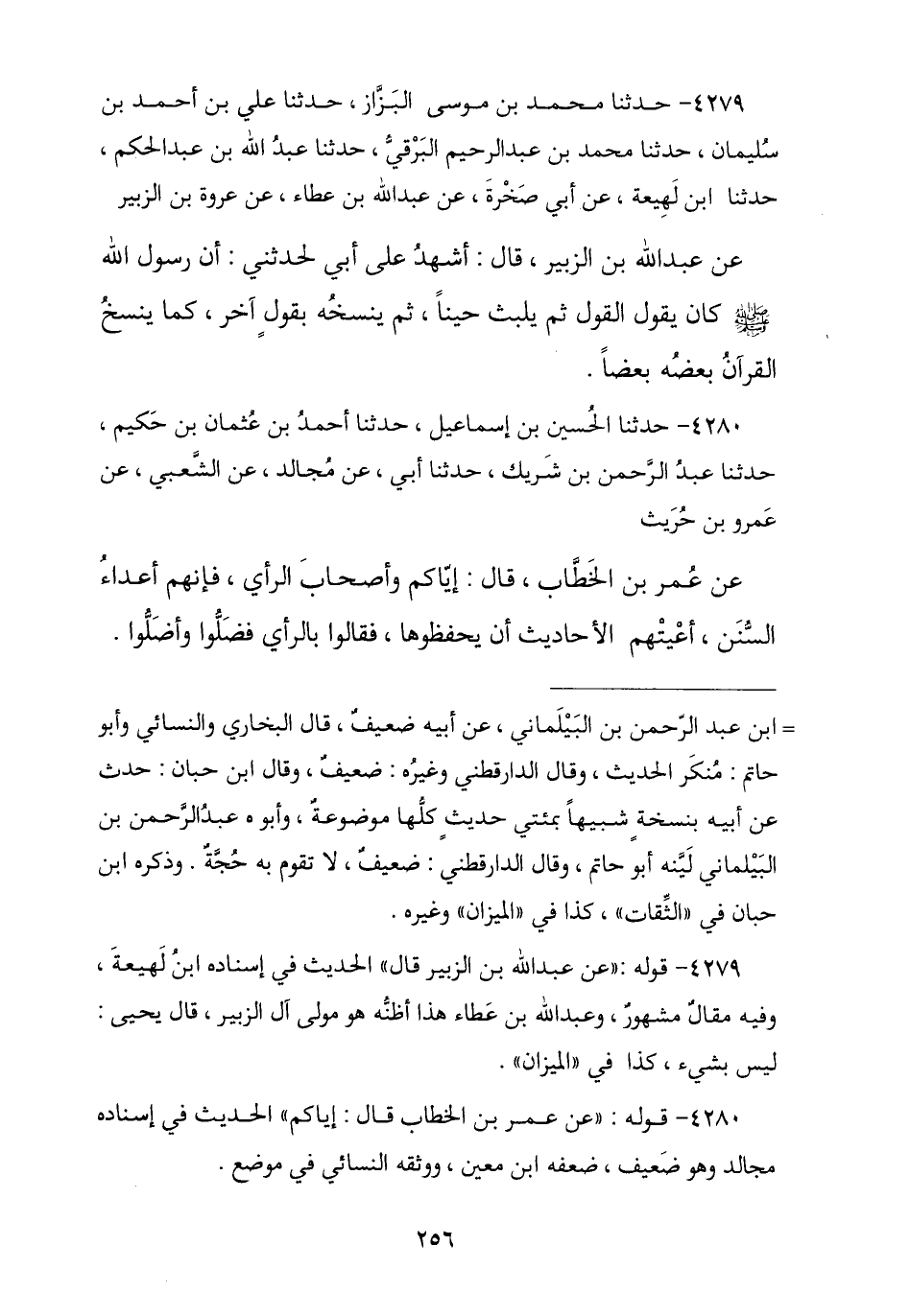 4279 - نا مُحَمَّدُ بْنُ مُوسَى الْبَزَّازُ , نا عَلِيُّ بْنُ أَحْمَدَ بْنِ سُلَيْمَانَ , نا مُحَمَّدُ بْنُ عَبْدِ الرَّحِيمِ الْبَرْقِيُّ , نا عَبْدُ اللَّهِ بْنُ عَبْدِ الْحَكَمِ , نا ابْنُ لَهِيعَةَ , عَنْ أَبِي صَخْرَةَ , عَنْ عَبْدِ اللَّهِ بْنِ عَطَاءٍ , عَنْ عُرْوَةَ بْنِ الزُّبَيْرِ , عَنْ عَبْدِ اللَّهِ بْنِ الزُّبَيْرِ , قَالَ: أَشْهَدُ عَلَى أَبِي يُحَدِّثُنِي: أَنَّ رَسُولَ اللَّهِ صَلَّى اللهُ عَلَيْهِ وَسَلَّمَ «كَانَ يَقُولُ الْقَوْلَ ثُمَّ يَلْبَثُ حِينًا ثُمَّ §يَنْسَخَهُ بِقَوْلٍ آخَرَ كَمَا يَنْسَخُ الْقُرْآنُ بَعْضُهُ بَعْضًا»