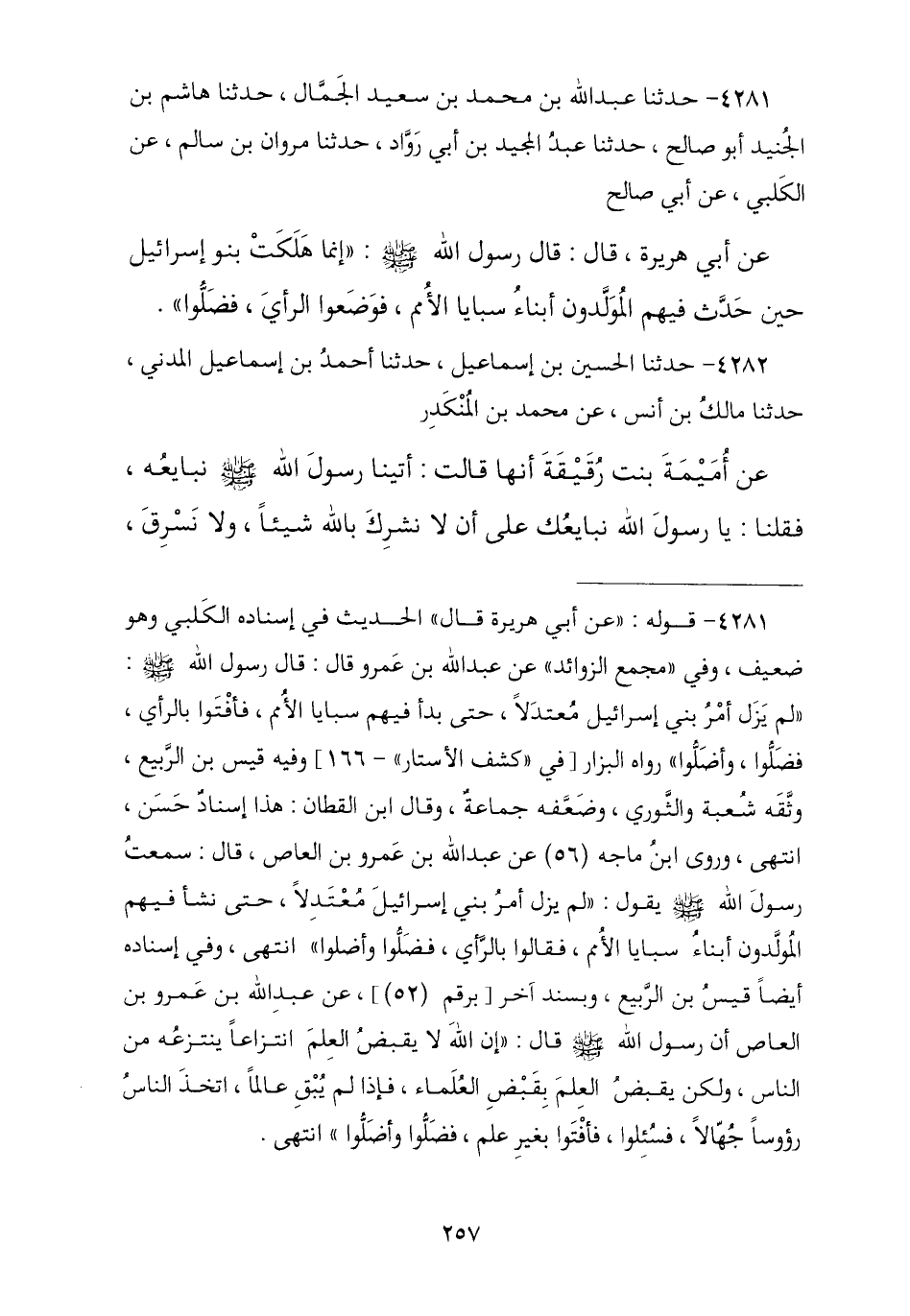 4281 - نا عَبْدُ اللَّهِ بْنُ مُحَمَّدِ بْنِ سَعِيدٍ الْجَمَالُ , نا هَاشِمُ بْنُ الْجُنَيْدِ أَبُو صَالِحٍ , نا عَبْدُ الْمَجِيدِ بْنُ أَبِي رَوَّادٍ , نا مَرْوَانُ بْنُ سَالِمٍ، عَنِ الْكَلْبِيِّ، عَنْ أَبِي صَالِحٍ , عَنْ أَبِي هُرَيْرَةَ , قَالَ: قَالَ رَسُولُ اللَّهِ صَلَّى اللهُ عَلَيْهِ وَسَلَّمَ: «إِنَّمَا §هَلَكَتْ بَنُو إِسْرَائِيلَ حِينَ حَدَّثَ فِيهِمُ الْمُوَلَّدُونَ أَبْنَاءُ سَبَايَا الْأُمَمِ , فَوَضَعُوا الرَّأْيَ فَضَلُّوا».