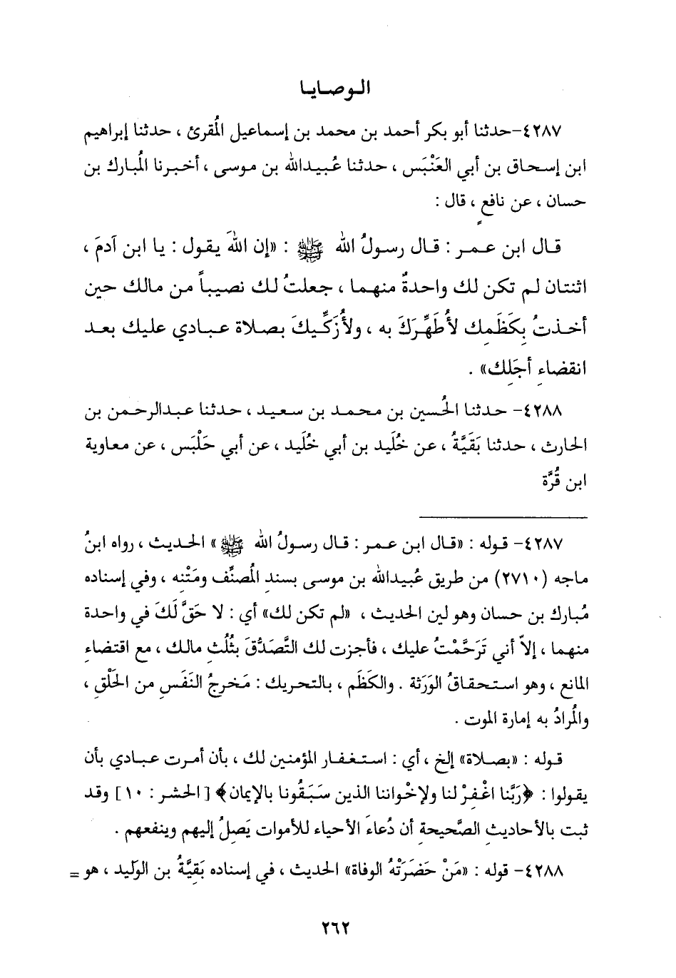 4287 - نا أَبُو بَكْرٍ أَحْمَدُ بْنُ مُحَمَّدِ بْنِ إِسْمَاعِيلَ الْمُقْرِئُ , نا إِبْرَاهِيمُ بْنُ إِسْحَاقَ بْنِ أَبِي الْعُبَيْسِيِّ , نا عُبَيْدُ اللَّهِ بْنُ مُوسَى , أنا الْمُبَارَكُ بْنُ حَسَّانَ , عَنْ نَافِعٍ , قَالَ: قَالَ ابْنُ عُمَرَ: قَالَ رَسُولُ اللَّهِ صَلَّى اللهُ عَلَيْهِ وَسَلَّمَ: " إِنَّ اللَّهَ عَزَّ وَجَلَّ يَقُولُ: يَا ابْنَ آدَمَ §اثْنَتَانِ لَمْ تَكُنْ لَكَ , وَاحِدَةٌ مِنْهُمَا جَعَلْتُ لَكَ نَصِيبًا مِنْ مَالِكَ حِينَ أَخَذْتُ بِكَظَمِكَ لِأُطَهِّرَكَ بِهِ وَلِأُزَكِّيَكَ , وَصَلَاةُ عِبَادِي عَلَيْكَ بَعْدَ انْقِضَاءِ أَجَلِكَ "