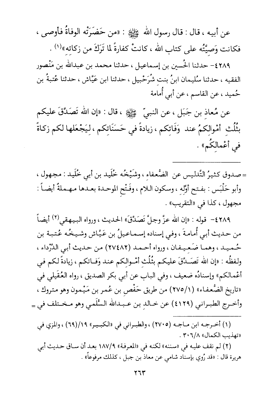 4289 - نا الْحُسَيْنُ بْنُ إِسْمَاعِيلَ , نا مُحَمَّدُ بْنُ عَبْدِ اللَّهِ بْنِ مَنْصُورٍ الْفَقِيهُ , نا سُلَيْمَانُ ابْنُ بِنْتِ شُرَحْبِيلَ , نا إِسْمَاعِيلُ بْنُ عَيَّاشٍ , نا عُتْبَةُ بْنُ حُمَيْدٍ , عَنِ الْقَاسِمِ , عَنْ أَبِي أُمَامَةَ , عَنْ مُعَاذِ بْنِ جَبَلٍ , عَنِ النَّبِيِّ صَلَّى اللهُ عَلَيْهِ وَسَلَّمَ قَالَ: § «إِنَّ اللَّهَ عَزَّ وَجَلَّ قَدْ تَصَدَّقَ عَلَيْكُمْ بِثُلُثِ أَمْوَالِكُمْ عِنْدَ وَفَاتِكُمْ زِيَادَةً فِي حَسَنَاتِكُمْ لِيَجْعَلَهَا لَكُمْ زَكَاةً فِي أَعْمَالِكُمْ»