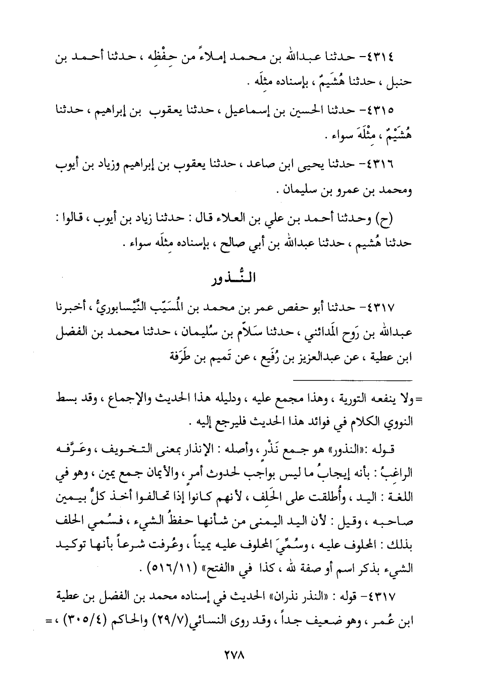 4317 - حَدَّثَنَا أَبُو حَفْصٍ عُمَرُ بْنُ مُحَمَّدِ بْنِ الْمُسَيِّبِ النَّيْسَابُورِيُّ , نا عَبْدُ اللَّهِ بْنُ رَوْحٍ الْمَدَائِنِيُّ , نا سَلَّامُ بْنُ سُلَيْمَانَ , نا مُحَمَّدُ بْنُ الْفَضْلِ بْنِ عَطِيَّةَ , عَنْ عَبْدِ الْعَزِيزِ بْنِ رُفَيْعٍ , عَنْ تَمِيمِ بْنِ طَرَفَةَ , -[279]- عَنْ عَدِيِّ بْنِ حَاتِمٍ , قَالَ: قَالَ رَسُولُ اللَّهِ صَلَّى اللهُ عَلَيْهِ وَسَلَّمَ: § «النَّذْرُ نَذْرَانِ , فَمَنْ نَذَرَ نَذْرًا لِلَّهِ فَلْيَفِ بِهِ , وَمَنْ نَذَرَ نَذْرًا فِي مَعْصِيَةِ اللَّهِ فَكَفَّارَتُهُ كَفَّارَةُ يَمِينٍ»