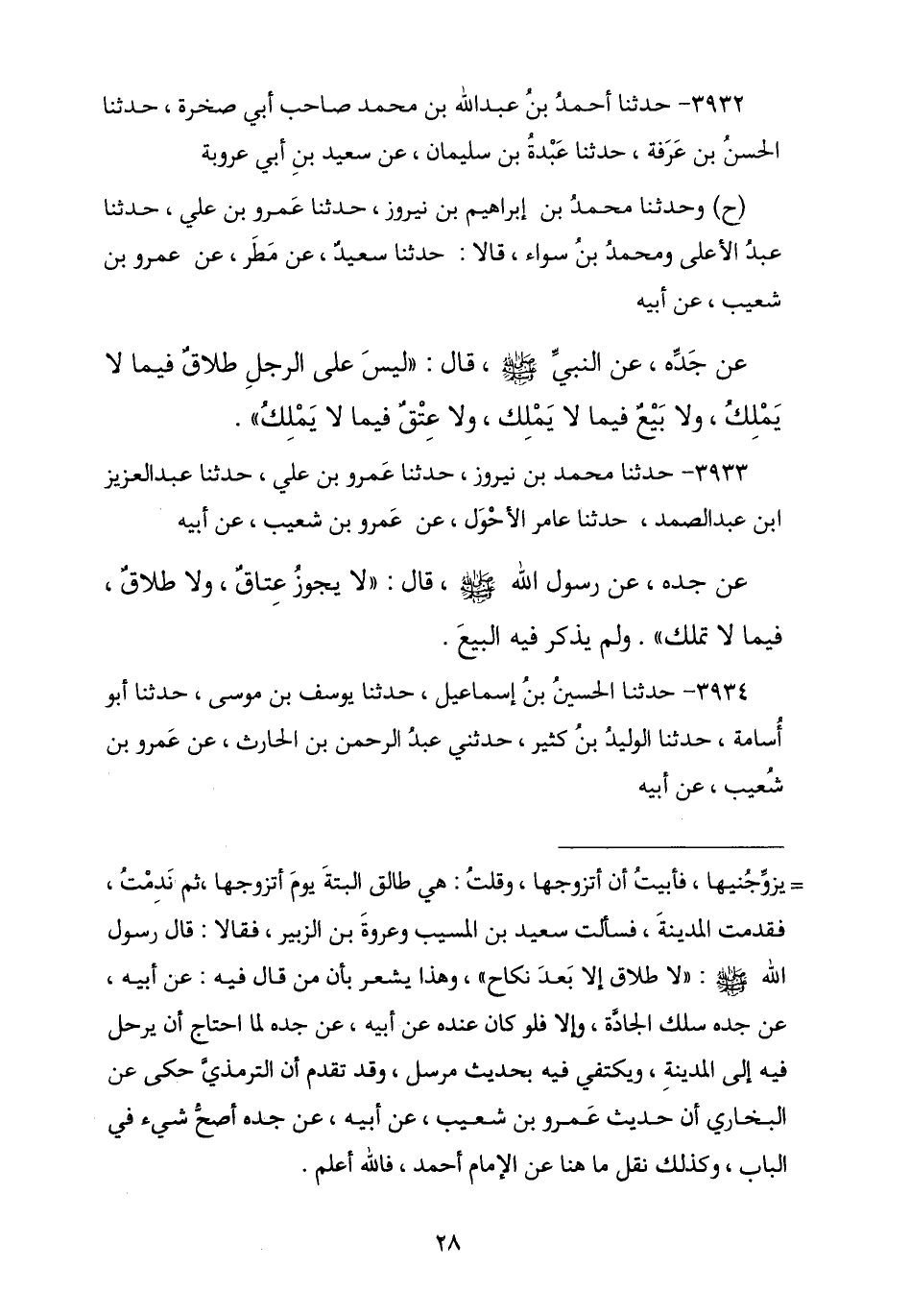 3932 - نا أَحْمَدُ بْنُ عَبْدِ اللَّهِ بْنِ مُحَمَّدٍ صَاحِبُ أَبِي صَخْرَةَ , نا الْحَسَنُ بْنُ عَرَفَةَ , نا عَبْدَةُ بْنُ سُلَيْمَانَ , عَنْ سَعِيدِ بْنِ أَبِي عَرُوبَةَ ح. وَنا مُحَمَّدُ بْنُ إِبْرَاهِيمَ بْنِ نَيْرُوزٍ , نا عَمْرُو بْنُ عَلِيٍّ , نا عَبْدُ الْأَعْلَى , وَمُحَمَّدُ بْنُ سَوَاءٍ , قَالَا: نا سَعِيدٌ , عَنْ مَطَرٍ , عَنْ عَمْرِو بْنِ شُعَيْبٍ , عَنْ أَبِيهِ , عَنْ جَدِّهِ , عَنِ النَّبِيِّ صَلَّى اللهُ عَلَيْهِ وَسَلَّمَ , قَالَ: § «لَيْسَ عَلَى الرَّجُلِ طَلَاقٌ فِيمَا لَا يَمْلِكُ , وَلَا بَيْعٌ فِيمَا لَا يَمْلِكُ , وَلَا عِتْقُ فِيمَا لَا يَمْلِكُ»