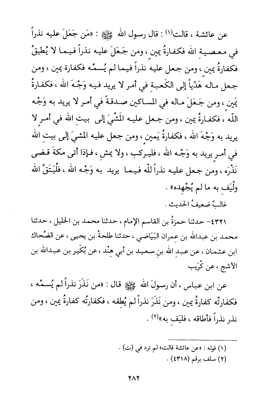 4321 - نا حَمْزَةُ بْنُ الْقَاسِمِ الْإِمَامُ , نا مُحَمَّدُ بْنُ الْخَلِيلِ , نا مُحَمَّدُ بْنُ عَبْدِ اللَّهِ بْنِ عِمْرَانَ الْبَيَاضِيُّ , نا طَلْحَةُ بْنُ يَحْيَى , عَنِ الضَّحَّاكِ بْنِ عُثْمَانَ , عَنْ عَبْدِ اللَّهِ بْنِ سَعِيدِ بْنِ أَبِي هِنْدَ , عَنْ بُكَيْرِ بْنِ عَبْدِ اللَّهِ بْنِ الْأَشَجِّ , عَنْ كُرَيْبٍ , عَنِ ابْنِ عَبَّاسٍ , أَنَّ رَسُولَ اللَّهِ صَلَّى اللهُ عَلَيْهِ وَسَلَّمَ , قَالَ: § «مَنْ نَذَرَ نَذْرًا لَمْ يُسَمِّهِ فَكَفَّارَتُهُ كَفَّارَةُ يَمِينٍ , وَمَنْ نَذَرَ نَذْرًا لَمْ يُطِقْهُ فَكَفَّارَتُهُ كَفَّارَةُ يَمِينٍ , وَمَنْ نَذَرَ نَذْرًا فَأَطَاقَهُ فَلْيَفِ بِهِ»