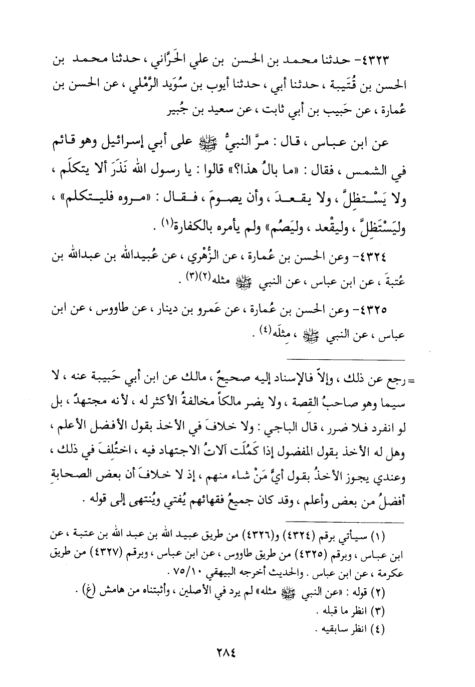4323 - نا مُحَمَّدُ بْنُ الْحَسَنِ بْنِ عَلِيٍّ الْحَرَّانِيُّ , نا مُحَمَّدُ بْنُ الْحَسَنِ بْنِ قُتَيْبَةَ , نا أَبِي , نا أَيُّوبُ بْنُ سُوَيْدٍ الرَّمْلِيُّ , عَنِ الْحَسَنِ بْنِ عُمَارَةَ , عَنْ حَبِيبِ بْنِ أَبِي ثَابِتٍ , عَنْ سَعِيدِ بْنِ جُبَيْرٍ , عَنِ ابْنِ عَبَّاسٍ , قَالَ: مَرَّ النَّبِيُّ صَلَّى اللهُ عَلَيْهِ وَسَلَّمَ عَلَى أَبِي إِسْرَائِيلَ وَهُوَ قَائِمٌ فِي الشَّمْسِ , فَقَالَ: «مَا بَالُ هَذَا؟» , فَقَالُوا: يَا رَسُولَ اللَّهِ نَذَرَ أَنْ لَا يَتَكَلَّمَ وَلَا يَسْتَظِلَّ وَلَا يَقْعُدَ وَأَنْ يَصُومَ , فَقَالَ: «مُرُوهُ §فَلْيَتَكَلَّمْ وَلْيَسْتَظِلَّ وَلْيَقْعُدْ وَلْيَصُمْ» , وَلَمْ يَأْمُرْهُ بِالْكَفَّارَةِ.