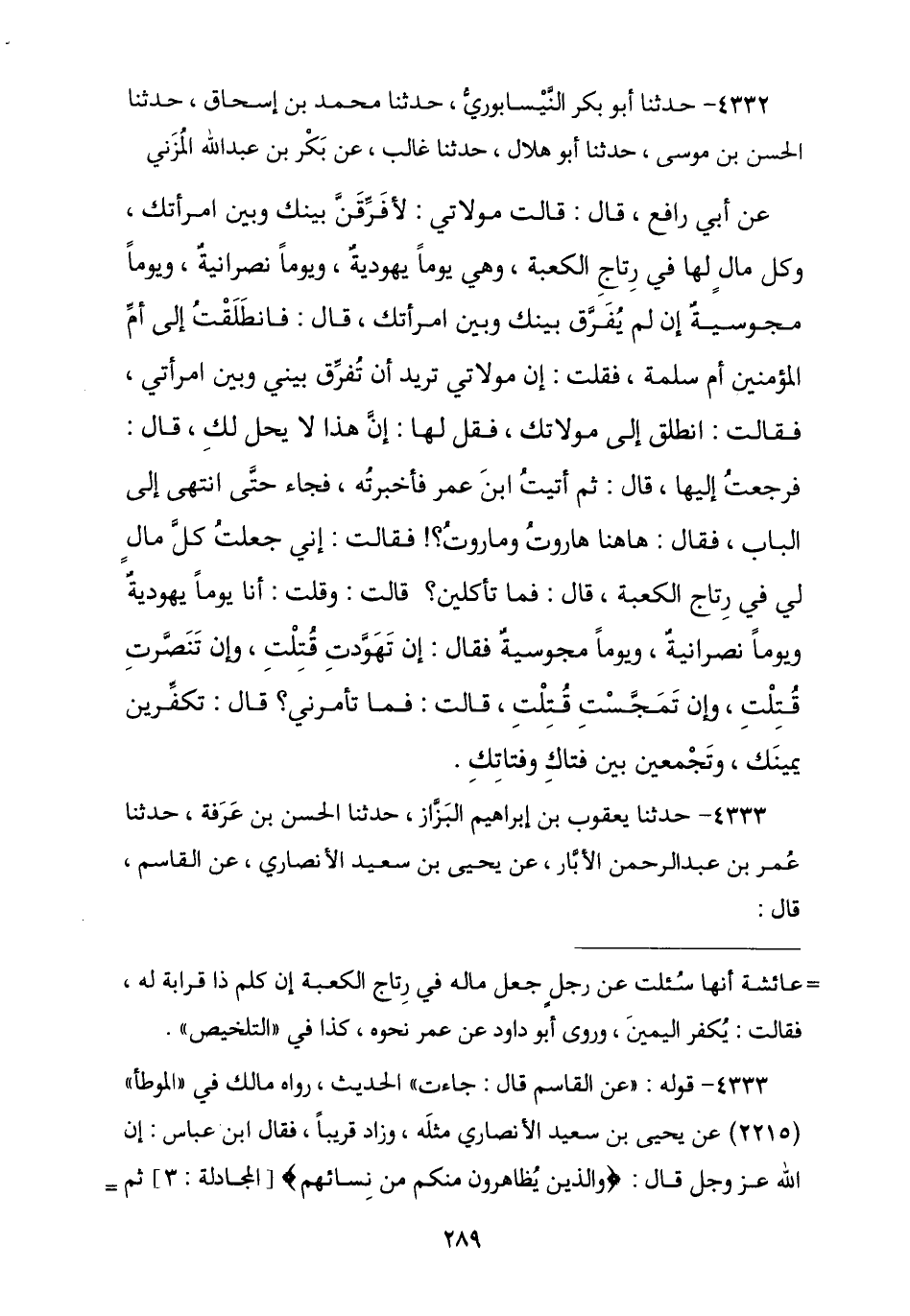 4332 - حَدَّثَنَا أَبُو بَكْرٍ النَّيْسَابُورِيُّ , نا مُحَمَّدُ بْنُ إِسْحَاقَ , نا الْحَسَنُ بْنُ مُوسَى , نا أَبُو هِلَالٍ , نا غَالِبٌ , عَنْ بَكْرِ بْنِ عَبْدِ اللَّهِ الْمُزَنِيِّ , عَنْ أَبِي رَافِعٍ , قَالَ: قَالَتْ مَوْلَاتِي: لَأُفَرِّقَنَّ بَيْنَكَ وَبَيْنَ امْرَأَتِكَ وَكُلُّ مَالٍ لَهَا فِي رِتَاجِ الْكَعْبَةِ , وَهِيَ يَوْمًا يَهُودِيَّةٌ وَيَوْمًا نَصْرَانِيَّةٌ وَيَوْمًا مَجُوسِيَّةٌ إِنْ لَمْ تُفَرِّقْ بَيْنَكَ وَبَيْنَ امْرَأَتِكَ , قَالَ: فَانْطَلَقْتُ إِلَى أُمِّ الْمُؤْمِنِينَ أُمِّ سَلَمَةَ , فَقُلْتُ: إِنَّ مَوْلَاتِي تُرِيدُ أَنْ تُفَرِّقَ بَيْنِي وَبَيْنَ امْرَأَتِي , فَقَالَتِ: انْطَلِقْ إِلَى مَوْلَاتِكَ فَقُلْ لَهَا: إِنَّ هَذَا لَا يَحِلُّ لَكِ , قَالَ: فَرَجَعْتُ إِلَيْهَا , قَالَ: ثُمَّ أَتَيْتُ ابْنَ عُمَرَ فَأَخْبَرْتُهُ فَجَاءَ حَتَّى انْتَهَى إِلَى الْبَابِ فَقَالَ: هَاهُنَا هَارُوتُ وَمَارُوتُ , فَقَالَتْ: إِنِّي جَعَلْتُ كُلَّ مَالٍ لِي فِي رِتَاجِ الْكَعْبَةِ , قَالَ: فَمَا تَأْكُلِينَ؟ , قَالَتْ: وَقُلْتُ: وَأَنَا يَوْمًا يَهُودِيَّةٌ وَيَوْمًا نَصْرَانِيَّةٌ وَيَوْمًا مَجُوسِيَّةٌ , قَالَ: إِنَّ تَهَوَّدْتِ قُتِلْتِ وَإِنْ تَنَصَّرْتِ قُتِلْتِ وَإِنْ تَمَجِّسْتِ قُتِلْتِ , قَالَتْ: فَمَا تَأْمُرُنِي , قَالَ: § «تُكَفِّرِي يَمِينَكِ وَتَجْمَعِينَ بَيْنَ فَتَاكِ وَفَتَاتِكِ»