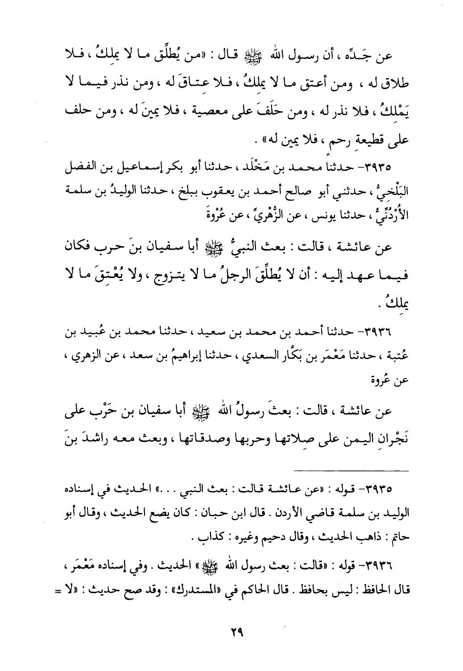 3935 - نا مُحَمَّدُ بْنُ مَخْلَدٍ , نا إِسْمَاعِيلُ بْنُ الْفَضْلِ الْبَلْخِيُّ , حَدَّثَنِي أَبُو صَالِحٍ أَحْمَدُ بْنُ يَعْقُوبَ بِبَلْخَ , نا الْوَلِيدُ بْنُ سَلَمَةَ الْأَزْدِيُّ , نا يُونُسُ , عَنِ الزُّهْرِيِّ , عَنْ عُرْوَةَ , عَنْ عَائِشَةَ , قَالَتْ: بَعَثَ النَّبِيُّ صَلَّى اللهُ عَلَيْهِ وَسَلَّمَ أَبَا سُفْيَانَ بْنَ حَرْبٍ فَكَانَ فِيمَا عَهَدَ إِلَيْهِ «أَنْ §لَا يُطَلِّقَ الرَّجُلُ مَنْ لَا يَتَزَوَّجُ وَلَا يُعْتِقَ مَنْ لَا يَمْلِكُ»