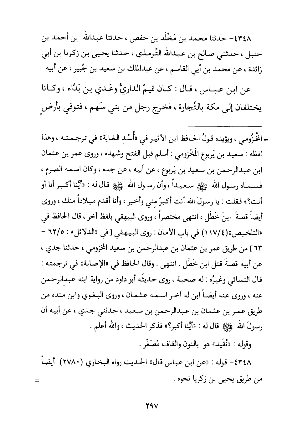 4348 - نا مُحَمَّدُ بْنُ مَخْلَدٍ , نا عَبْدُ اللَّهِ بْنُ أَحْمَدَ بْنِ حَنْبَلٍ , حَدَّثَنِي صَالِحُ بْنُ عَبْدِ اللَّهِ التِّرْمِذِيُّ , حَدَّثَنِي يَحْيَى بْنُ زَكَرِيَّا بْنِ أَبِي زَائِدَةَ , عَنْ مُحَمَّدِ بْنِ أَبِي الْقَاسِمِ , عَنْ عَبْدِ الْمَلِكِ بْنِ سَعِيدِ بْنِ جُبَيْرٍ , عَنْ أَبِيهِ , عَنِ ابْنِ عَبَّاسٍ , قَالَ: كَانَ تَمِيمٌ الدَّارِيُّ , وَعَدِيُّ بْنُ بَدَّاءٍ وَكَانَا يَخْتَلِفَانِ إِلَى مَكَّةَ بِالتِّجَارَةِ فَخَرَجَ رَجُلٌ مِنْ بَنِي سَهْمٍ فَتُوُفِّيَ بِأَرْضٍ -[298]- لَيْسَ بِهَا مُسْلِمٌ , فَأَوْصَى إِلَيْهِمَا فَدَفَعَا تَرِكَتَهُ إِلَى أَهْلِهِ وَحَبَسَا جَامًا مِنْ فِضَّةٍ مُخَوَّصًا بِالذَّهَبِ , «فَاسْتَحْلَفَهُمَا رَسُولُ اللَّهِ صَلَّى اللهُ عَلَيْهِ وَسَلَّمَ §مَا كَتَمْتُمَا وَلَا اطَّلَعْتُمَا» , ثُمَّ عُرِفَ الْجَامُ بِمَكَّةَ , فَقَالُوا: اشْتَرَيْنَاهُ مِنْ عَدِيِّ بْنِ بَدَّاءٍ وَتَمِيمٍ , فَقَدِمَ رَجُلَانِ مِنْ أَوْلِيَاءِ السَّهْمِيِّ فَحَلَفَا بِاللَّهِ أَنَّ هَذَا الْجَامَ لِلسَّهْمِيِّ وَلَشَهَادَتُهُمَا أَحَقُّ مِنْ شَهَادَتِهِمَا {وَمَا اعْتَدَيْنَا إِنَّا إِذًا لَمِنَ الظَّالِمِينَ} [المائدة: 107] , فَأَخَذُوا الْجَامَ وَفِيهِمْ نَزَلَتْ هَذِهِ الْآيَةُ