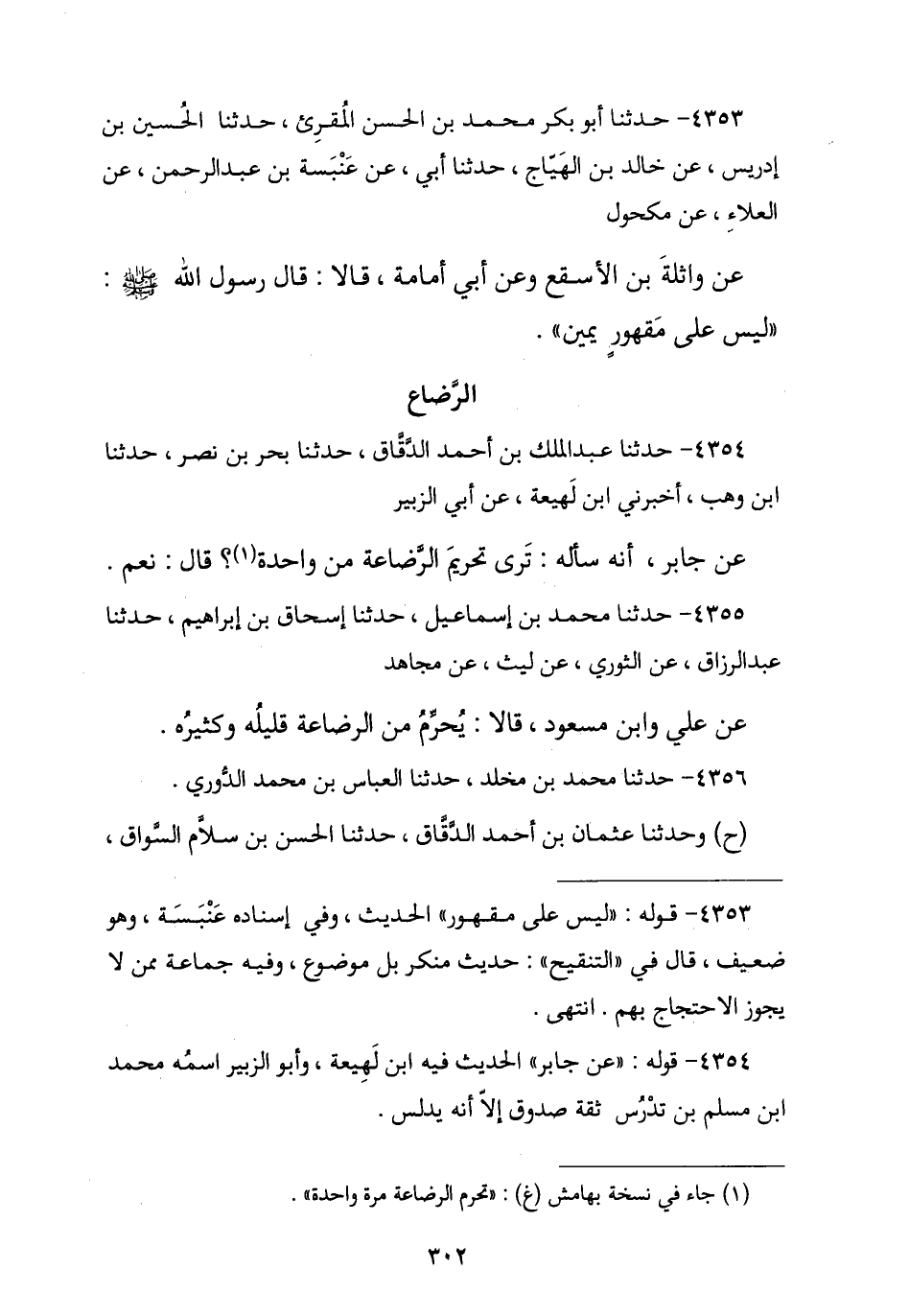 4354 - حَدَّثَنَا عَبْدُ الْمَلِكِ بْنُ أَحْمَدَ الدَّقَّاقُ , نا بَحْرُ بْنُ نَصْرٍ , نا ابْنُ وَهْبٍ , أَخْبَرَنِي ابْنُ لَهِيعَةَ , عَنْ أَبِي الزُّبَيْرِ , عَنْ جَابِرٍ , أَنَّهُ سَأَلَهُ: تَرَى §تُحَرِّمُ مِنَ الرَّضَاعَةِ مَرَّةٌ وَاحِدَةٌ؟ , قَالَ: «نَعَمْ»