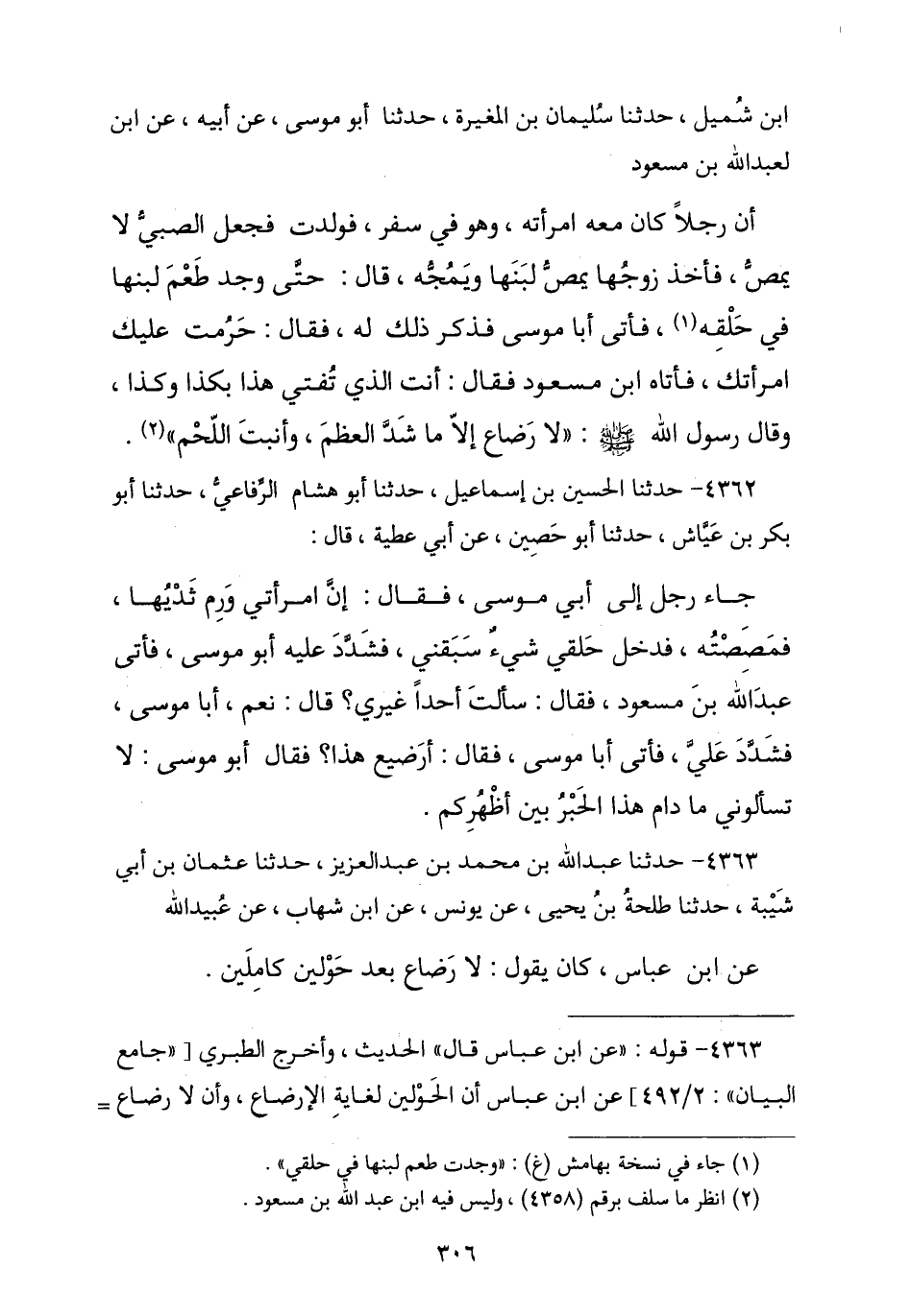 4362 - نا الْحُسَيْنُ بْنُ إِسْمَاعِيلَ , نا أَبُو هِشَامٍ الرِّفَاعِيُّ , نا أَبُو بَكْرِ بْنُ عَيَّاشٍ , نا أَبُو حُصَيْنٍ , عَنْ أَبِي عَطِيَّةَ , قَالَ: جَاءَ رَجُلٌ إِلَى أَبِي مُوسَى , فَقَالَ: إِنَّ امْرَأَتِي وَرَمَ ثَدْيُهَا فَمَصَصْتُهُ فَدَخَلَ فِي حَلْقِي شَيْءٌ سَبَقَنِي , فَشَدَّدَ عَلَيْهِ أَبُو مُوسَى , فَأَتَى عَبْدَ اللَّهِ بْنَ مَسْعُودٍ , فَقَالَ: «سَأَلْتَ أَحَدًا غَيْرِي؟» , قَالَ: نَعَمْ أَبَا مُوسَى فَشَدَّدَ عَلَيَّ , فَأَتَى أَبَا مُوسَى , فَقَالَ: «§أَرَضِيعٌ هَذَا؟» , فَقَالَ أَبُو مُوسَى: لَا تَسْأَلُونِي مَا دَامَ هَذَا الْحَبْرُ بَيْنَ أَظْهُرِكُمْ