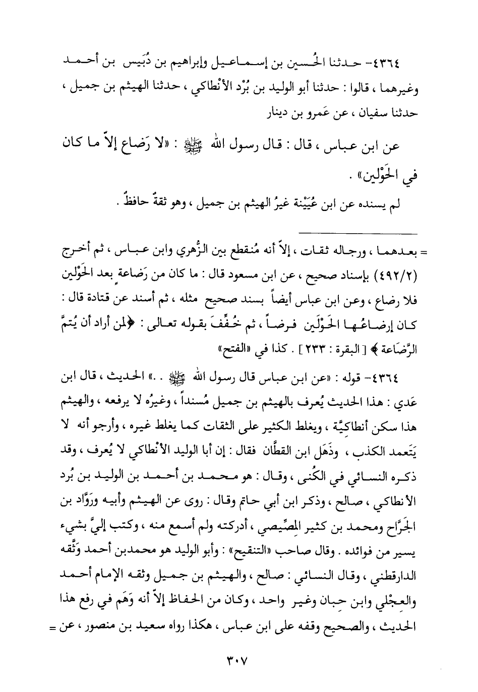 4364 - نا الْحُسَيْنُ بْنُ إِسْمَاعِيلَ , وَإِبْرَاهِيمُ بْنُ دُبَيْسِ بْنِ أَحْمَدَ , وَغَيْرُهُمَا قَالُوا: نا أَبُو الْوَلِيدِ بْنُ بُرْدٍ الْأَنْطَاكِيُّ , نا الْهَيْثَمُ بْنُ جَمِيلٍ , نا سُفْيَانُ , عَنْ عَمْرِو بْنِ دِينَارٍ , عَنِ ابْنِ عَبَّاسٍ , قَالَ رَسُولُ اللَّهِ صَلَّى اللهُ عَلَيْهِ وَسَلَّمَ: § «لَا رَضَاعَ إِلَّا مَا كَانَ فِي الْحَوْلَيْنِ». لَمْ يُسْنِدْهُ عَنِ ابْنِ عُيَيْنَةَ غَيْرُ الْهَيْثَمِ بْنِ جَمِيلٍ وَهُوَ ثِقَةٌ حَافِظٌ