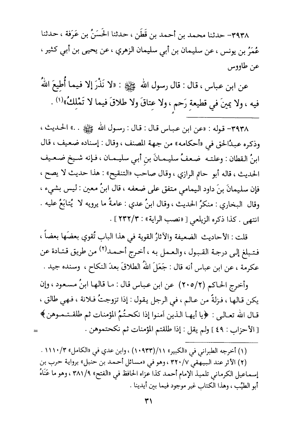 3938 - نا مُحَمَّدُ بْنُ أَحْمَدَ بْنِ قَطَنٍ , نا الْحَسَنُ بْنُ عَرَفَةَ , نا عُمَرُ بْنُ يُونُسَ , عَنْ سُلَيْمَانَ بْنِ أَبِي سُلَيْمَانَ الزُّهْرِيِّ , عَنْ يَحْيَى بْنِ أَبِي كَثِيرٍ , عَنْ طَاوُسٍ , عَنِ ابْنِ عَبَّاسٍ , قَالَ: قَالَ رَسُولُ اللَّهِ صَلَّى اللهُ عَلَيْهِ وَسَلَّمَ: § «لَا نَذْرَ إِلَّا فِيمَا أُطِيعُ اللَّهُ فِيهِ , وَلَا يَمِينَ فِي قَطِيعَةِ رَحِمٍ , وَلَا عَتَاقَ وَلَا طَلَاقَ فِيمَا لَا يَمْلِكُ»