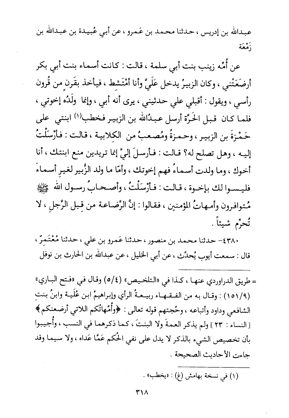 4380 - نا مُحَمَّدُ بْنُ مَنْصُورِ بْنِ النَّضْرِ , نا عَمْرُو بْنُ عَلِيٍّ , نا مُعْتَمِرٌ , قَالَ: سَمِعْتُ أَيُّوبَ , يُحَدِّثُ عَنْ أَبِي الْخَلِيلِ , عَنْ عَبْدِ اللَّهِ بْنِ الْحَارِثِ بْنِ نَوْفَلٍ , -[319]- عَنْ أُمِّ الْفَضْلِ , قَالَتْ: سَمِعْتُ رَسُولَ اللَّهِ صَلَّى اللهُ عَلَيْهِ وَسَلَّمَ , يَقُولُ: § «لَا تُحَرِّمُ الْإِمْلَاجَةُ , وَالْإِمْلَاجَتَانِ»
