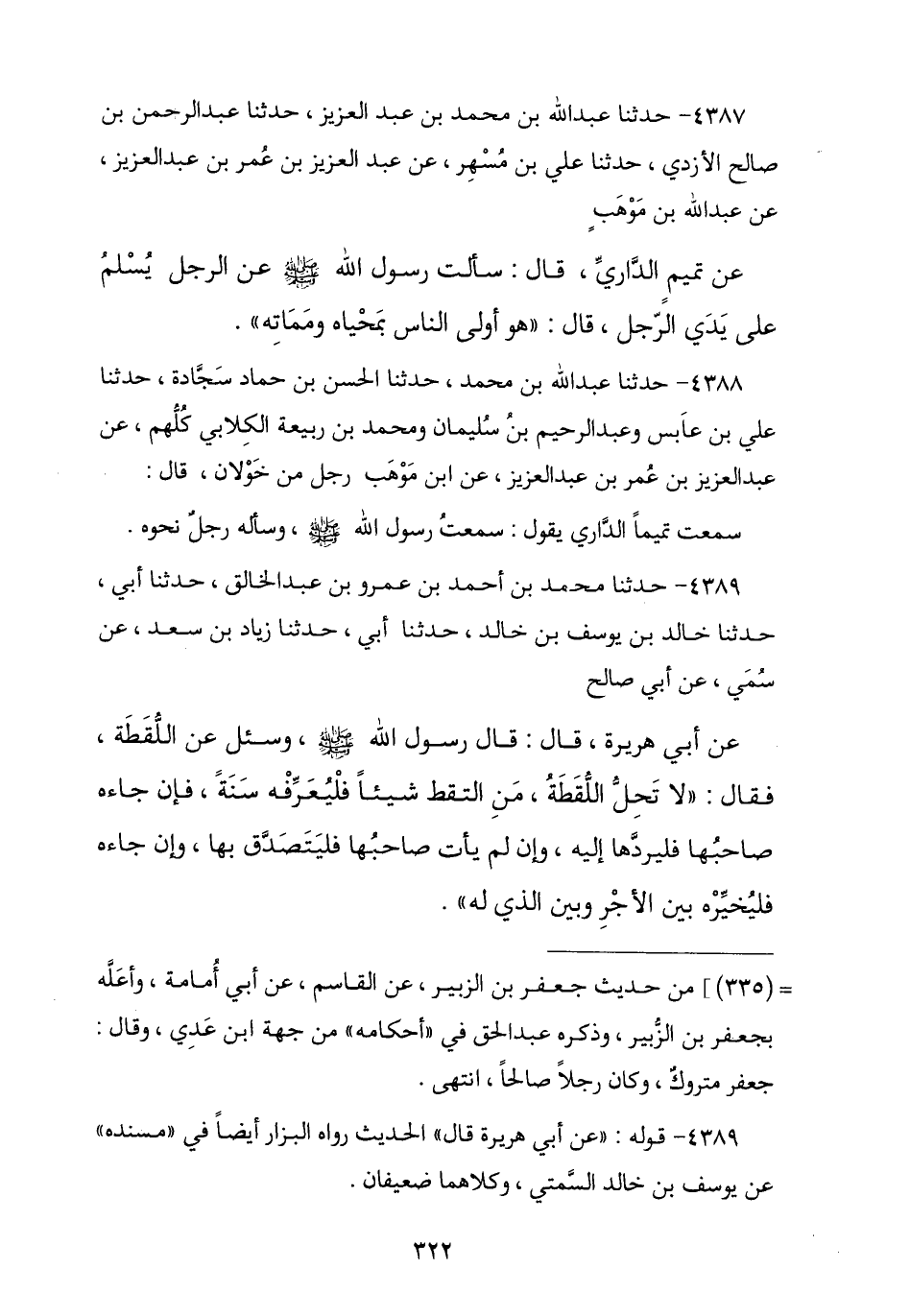 4387 - نا عَبْدُ اللَّهِ بْنُ مُحَمَّدِ بْنِ عَبْدِ الْعَزِيزِ , ونا عَبْدُ الرَّحْمَنِ بْنُ صَالِحٍ الْأَزْدِيُّ , نا عَلِيُّ بْنُ مُسْهِرٍ , عَنْ عَبْدِ الْعَزِيزِ بْنِ عُمَرَ بْنِ عَبْدِ الْعَزِيزِ , عَنْ عَبْدِ اللَّهِ بْنِ مَوْهَبٍ , عَنْ تَمِيمٍ الدَّارِيِّ , قَالَ: سَأَلْتُ رَسُولَ اللَّهِ صَلَّى اللهُ عَلَيْهِ وَسَلَّمَ عَنِ الرَّجُلِ يُسْلِمُ عَلَى يَدَيِ الرَّجُلِ؟ , قَالَ: § «هُوَ أَوْلَى النَّاسِ بِمَحْيَاهُ وَمَمَاتِهِ».