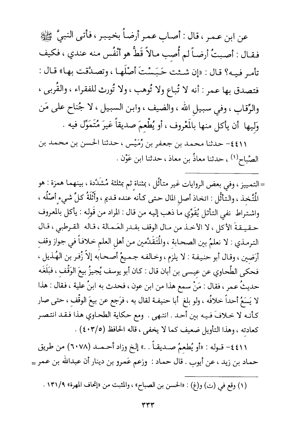 4411 - نا مُحَمَّدُ بْنُ جَعْفَرِ بْنِ رُمَيْسٍ , نا الْحَسَنُ بْنُ مُحَمَّدِ بْنِ الصَّبَّاحِ , نا مُعَاذُ بْنُ مُعَاذٍ , نا ابْنُ عَوْنٍ -[334]- ح وَنا عُمَرُ بْنُ أَحْمَدَ بْنِ عَلِيٍّ الْقَطَّانُ , نا مُحَمَّدُ بْنُ عُثْمَانَ بْنِ كَرَامَةَ , نا أَبُو أُسَامَةَ , عَنِ ابْنِ عَوْنٍ , عَنْ نَافِعٍ , عَنِ ابْنِ عُمَرَ , قَالَ: أَصَابَ عُمَرُ رَضِيَ اللَّهُ عَنْهُ أَرْضًا بِخَيْبَرَ فَأَتَى النَّبِيَّ صَلَّى اللهُ عَلَيْهِ وَسَلَّمَ , فَقَالَ: يَا رَسُولَ اللَّهِ مَا أَصَبْتُ مَالًا قَطُّ هُوَ أَنْفَسُ عِنْدِي مِنْهُ فَمَا تَأْمُرُنِي؟ , فَقَالَ: «إِنْ شِئْتَ §جَعَلْتَهَا لِلَّهِ حَبَسْتَ أَصْلَهَا وَتَصَدَّقْتَ بِهَا» , فَجَعَلَهَا عُمَرُ صَدَقَةً عَلَى الْفُقَرَاءِ وَفِي الْقُرْبَى وَفِي الرِّقَابِ وَابْنِ السَّبِيلِ وَالضَّيْفِ لَا جُنَاحَ عَلَى مَنْ وَلِيَهَا أَنْ يَأْكُلَ مِنْهَا بِالْمَعْرُوفِ أَوْ يُطْعِمَ صَدِيقًا غَيْرَ مُتَمَوِّلٍ فِيهِ. قَالَ أَبُو أُسَامَةَ: قَالَ بَعْضُ أَصْحَابِنَا: عَنِ ابْنِ عَوْنٍ: ذَكَرْتُ حَدِيثَ نَافِعٍ لِمُحَمَّدِ بْنِ سِيرِينَ , فَقَالَ: «غَيْرَ مُتَأَثِّلٍ مَالًا». وَقَالَ: حَدَّثَنَا أَبُو أُسَامَةَ , عَنِ ابْنِ عَوْنٍ , حَدَّثَنِي رَجُلُ أَنَّهُ قَرَأَ تِلْكَ الرُّقْعَةَ فَكَانَ فِيهَا: «غَيْرَ مُتَأَثِّلٍ مَالًا» هَذَا حَدِيثُ أَبِي أُسَامَةَ.