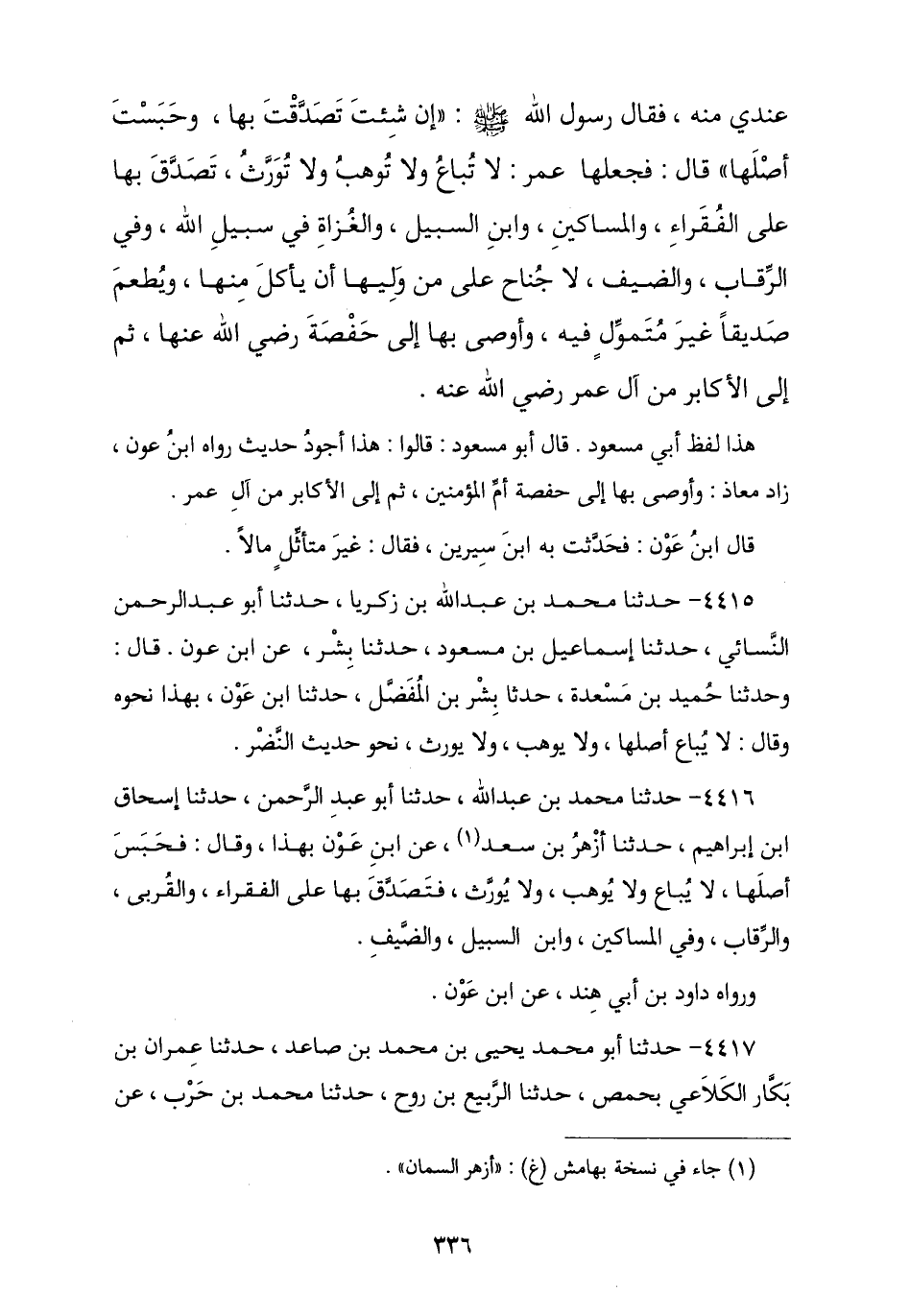 4417 - نا أَبُو مُحَمَّدٍ يَحْيَى بْنُ مُحَمَّدِ بْنِ صَاعِدٍ نا عِمْرَانُ بْنُ بَكَّارٍ الْكَلَاعِيُّ بِحِمْصَ , نا الرَّبِيعُ بْنُ رَوْحٍ , نا مُحَمَّدُ بْنُ حَرْبٍ , عَنِ -[337]- الزُّبَيْدِيِّ , عَنْ عَدِيِّ بْنِ عَبْدِ الرَّحْمَنِ , عَنْ دَاوُدَ بْنِ أَبِي هِنْدَ , عَنْ عَبْدِ اللَّهِ بْنِ عَوْنٍ , عَنْ نَافِعٍ , عَنِ ابْنِ عُمَرَ , قَالَ: أَتَى عُمَرُ النَّبِيَّ صَلَّى اللهُ عَلَيْهِ وَسَلَّمَ , فَقَالَ: إِنِّي أَصَبْتُ أَرْضًا بِخَيْبَرَ مَا أَصَبْتُ مَالًا قَطُّ هُوَ أَنْفَسُ عِنْدِي مِنْهُ فَمَا تَأْمُرُنِي؟ , قَالَ: «إِنْ شِئْتَ §حَبَسْتَ أَصْلَهَا وَتَصَدَّقْتَ بِهَا» , قَالَ: فَحَبَسَ عُمَرُ أَصْلَهَا وَتَصَدَّقَ بِهَا , لَا يُبَاعُ وَلَا يُوهَبُ وَلَا يُورَثُ , فِي الْفُقَرَاءِ وَالْقُرْبَى وَالرِّقَابِ وَفِي سَبِيلِ اللَّهِ وَابْنِ السَّبِيلِ وَالضَّيْفِ , لَا جُنَاحَ عَلَى مَنْ وَلِيَهَا أَنْ يَأْكُلَ بِالْمَعْرُوفِ وَأَنْ يُطْعِمَ صَدِيقًا غَيْرَ مُتَمَوِّلٍ فِيهِ. وَرَوَاهُ الثَّوْرِيُّ , عَنِ ابْنِ عَوْنٍ , عَنْ نَافِعِ , عَنِ ابْنِ عُمَرَ