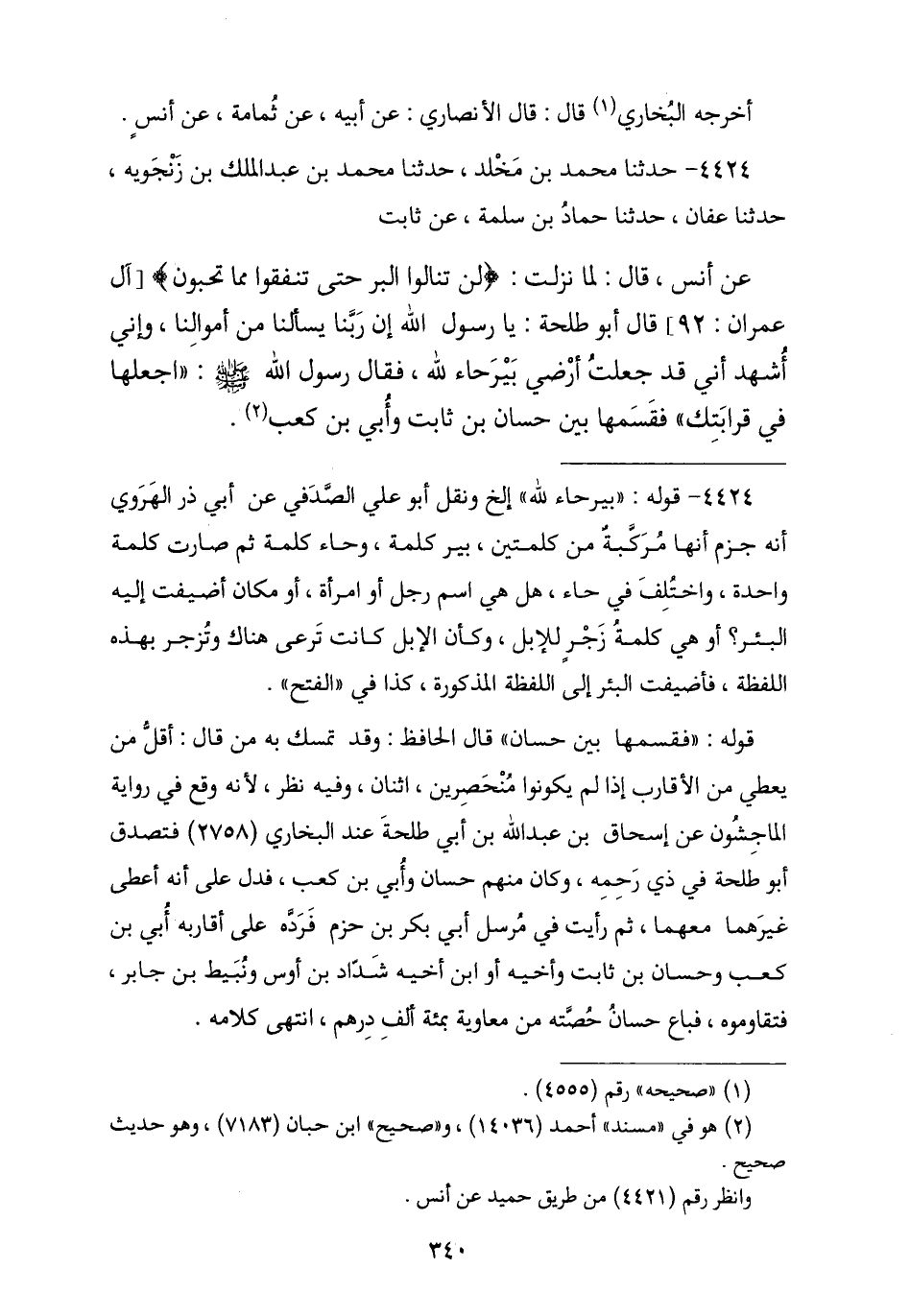 4424 - نا مُحَمَّدُ بْنُ مَخْلَدٍ , نا مُحَمَّدُ بْنُ عَبْدِ الْمَلِكِ زَنْجُوَيْهِ نا عَفَّانُ , نا حَمَّادُ بْنُ سَلَمَةَ , عَنْ ثَابِتٍ , عَنْ أَنَسٍ , قَالَ: لَمَّا نَزَلَتْ {لَنْ تَنَالُوا الْبِرَّ حَتَّى تُنْفِقُوا مِمَّا تُحِبُّونَ} [آل عمران: 92] , قَالَ أَبُو طَلْحَةَ: يَا رَسُولَ اللَّهِ إِنَّ رَبَّنَا يَسْأَلُنَا مِنْ أَمْوَالِنَا وَإِنِّي أُشْهِدُكَ أَنِّي قَدْ جَعَلْتُ أَرْضِي بِئْرَ حَاءَ لِلَّهِ , فَقَالَ رَسُولُ اللَّهِ صَلَّى اللهُ عَلَيْهِ وَسَلَّمَ: § «اجْعَلْهَا فِي قَرَابَتِكَ» , فَقَسَمَهَا بَيْنَ حَسَّانَ بْنِ ثَابِتٍ , وَأُبَيِّ بْنِ كَعْبٍ