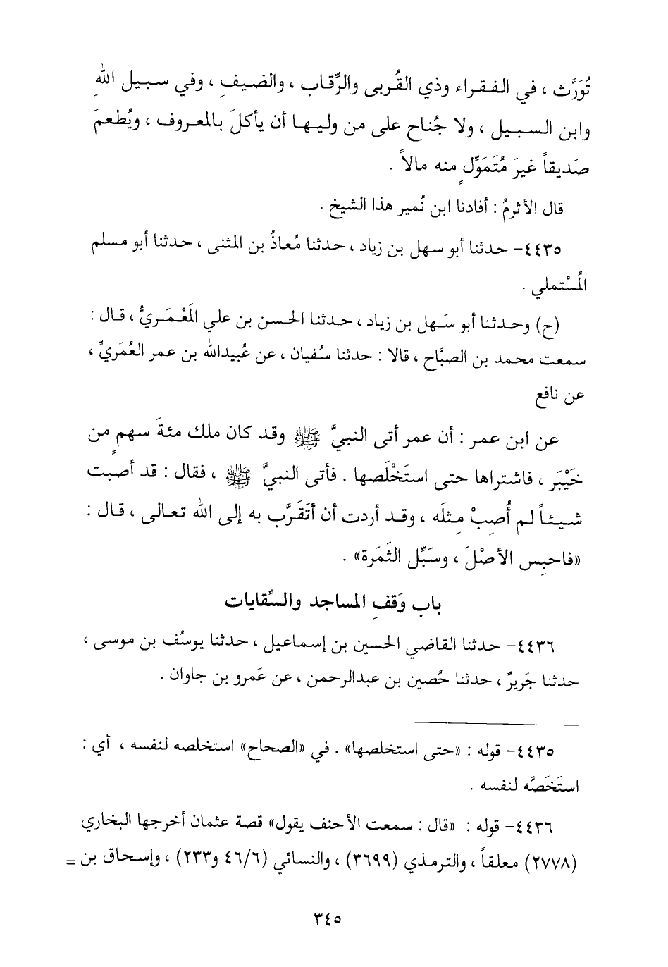 4435 - نا أَبُو سَهْلِ بْنُ زِيَادٍ , نا مُعَاذُ بْنُ الْمُثَنَّى , نا أَبُو مُسْلِمٍ الْمُسْتَمْلِي ح وَنا أَبُو سَهْلِ بْنُ زِيَادٍ , نا الْحَسَنُ بْنُ عَلِيٍّ الْمَعْمَرِيُّ , قَالَ: سَمِعْتُ مُحَمَّدَ بْنَ الصَّبَّاحِ , قَالَا: نا سُفْيَانُ , عَنْ عُبَيْدِ اللَّهِ بْنِ عُمَرَ الْعُمَرِيُّ , عَنْ نَافِعٍ , عَنِ ابْنِ عُمَرَ , أَنَّ عُمَرَ أَتَى النَّبِيَّ صَلَّى اللهُ عَلَيْهِ وَسَلَّمَ وَقَدْ كَانَ مَلَكَ مِائَةَ سَهْمٍ مِنْ خَيْبَرَ فَاشْتَرَاهَا حَتَّى اسْتَخْلَصَهَا فَأَتَى النَّبِيَّ صَلَّى اللهُ عَلَيْهِ وَسَلَّمَ , فَقَالَ: قَدْ أَصَبْتُ شَيْئًا لَمْ أُصِبْ مِثْلَهُ وَقَدْ أَرَدْتُ أَنْ أَتَقَرَّبَ بِهِ إِلَى اللَّهِ عَزَّ وَجَلَّ , قَالَ: § «فَاحْتَبِسِ الْأَصْلَ وَسَبِّلِ الثَّمَرَ»