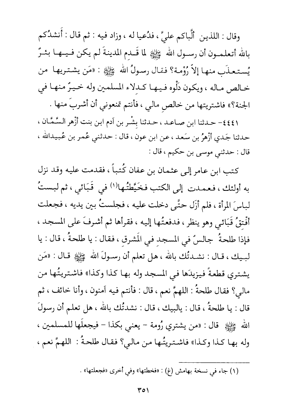 4441 - نا ابْنُ صَاعِدٍ , نا بِشْرُ بْنُ آدَمَ بْنِ بِنْتِ أَزْهَرَ السَّمَّانُ , نا جَدِّي أَزْهَرُ بْنُ سَعِيدٍ , عَنِ ابْنِ عَوْنٍ , حَدَّثَنِي عُمَرُ بْنُ عُبَيْدِ اللَّهِ , حَدَّثَنِي مُوسَى بْنُ حَكِيمٍ , قَالَ: كَتَبَ ابْنُ عَامِرٍ إِلَى عُثْمَانَ كِتَابًا فَقَدِمْتُ عَلَيْهِ وَقَدْ نَزَلَ بِهِ أُولَئِكَ فَعَمَدْتُ إِلَى الْكُتُبِ فَخَيَّطْتُهَا فَجَعَلْتُهَا فِي قِبَائِي ثُمَّ لَبِسْتُ لِبَاسَ الْمَرْأَةِ فَلَمْ أَزَلْ حَتَّى دَخَلْتُ عَلَيْهِ فَجَلَسْتُ بَيْنَ يَدَيْهِ فَجَعَلْتُ أُفَتِّقُ قِبَائِي وَهُوَ يَنْظُرُ فَدَفَعْتُهَا إِلَيْهِ , فَقَرَأَهَا ثُمَّ أَشْرَفَ عَلَى الْمَسْجِدِ فَإِذَا طَلْحَةُ جَالِسٌ فِي الْمَسْجِدِ فِي الْمَشْرِقِ , فَقَالَ: يَا طَلْحَةُ , قَالَ: يَا لَبَّيْكَ , قَالَ: نَشَدْتُكَ بِاللَّهِ هَلْ تَعْلَمُ أَنَّ رَسُولَ اللَّهِ صَلَّى اللهُ عَلَيْهِ وَسَلَّمَ قَالَ: § «مَنْ يَشْتَرِي قِطْعَةَ فَيَزِيدُهَا فِي الْمَسْجِدِ وَلَهُ بِهَا كَذَا وَكَذَا» , فَاشْتَرَيْتُهَا مِنْ مَالِي فَقَالَ طَلْحَةُ اللَّهُمَّ نَعَمْ , قَالَ: فَأَنْتُمْ فِيهِ آمِنُونَ وَأَنَا فِيهِ خَائِفٌ , ثُمَّ قَالَ: يَا طَلْحَةُ , قَالَ: يَا لَبَّيْكَ , قَالَ: أَنْشَدْتُكَ بِاللَّهِ هَلْ تَعْلَمُ أَنَّ رَسُولَ اللَّهِ صَلَّى اللهُ عَلَيْهِ وَسَلَّمَ قَالَ: «مَنْ يَشْتَرِي بِئْرَ رُومَةَ» , يَعْنِي بِكَذَا فَيَجْعَلُهَا لِلْمُسْلِمِينَ وَلَهُ بِهَا كَذَا كَذَا فَاشْتَرَيْتُهَا مِنْ مَالِي؟ , فَقَالَ طَلْحَةُ: اللَّهُمَّ نَعَمْ , -[352]- فَقَالَ: يَا طَلْحَةُ , قَالَ: يَا لَبَّيْكَ , قَالَ: نَشَدْتُكَ بِاللَّهِ هَلْ تَعْلَمُنِي حَمَلْتُ فِي جَيْشِ الْعُسْرَةِ عَلَى مِائَةٍ , قَالَ طَلْحَةُ: اللَّهُمَّ نَعَمْ , ثُمَّ قَالَ طَلْحَةُ: اللَّهُمَّ لَا أَعْلَمُ عُثْمَانَ إِلَّا مَظْلُومًا