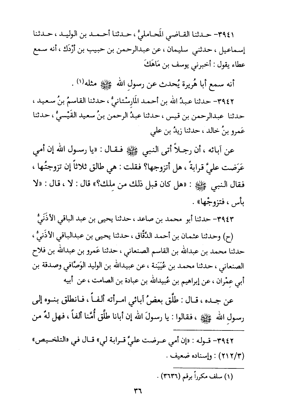 3942 - حَدَّثَنَا عَبْدُ اللَّهِ بْنُ أَحْمَدَ الْمَارَسْتَانِيُّ , نا الْقَاسِمُ بْنُ سَعِيدٍ , نا عَبْدُ الرَّحْمَنِ بْنُ قَيْسٍ , نا عَبْدُ الرَّحْمَنِ بْنُ سَعِيدٍ , نا عَمْرُو بْنُ خَالِدٍ , نا زَيْدُ بْنُ عَلِيٍّ , عَنْ آبَائِهِ أَنَّ رَجُلًا أَتَى النَّبِيَّ صَلَّى اللهُ عَلَيْهِ وَسَلَّمَ , فَقَالَ: يَا رَسُولَ اللَّهِ إِنَّ أُمِّي عَرَضَتْ عَلَيَّ قَرَابَةً لِي أَتَزَوَّجُهَا , فَقُلْتُ: هِيَ طَالِقٌ ثَلَاثًا إِنْ تَزَوَّجْتُهَا , فَقَالَ النَّبِيُّ صَلَّى اللهُ عَلَيْهِ وَسَلَّمَ: § «هَلْ كَانَ قَبْلَ ذَلِكَ مِنْ مِلْكٍ؟» , قَالَ: لَا , قَالَ: «لَا بَأْسَ فَتَزَوَّجْهَا»