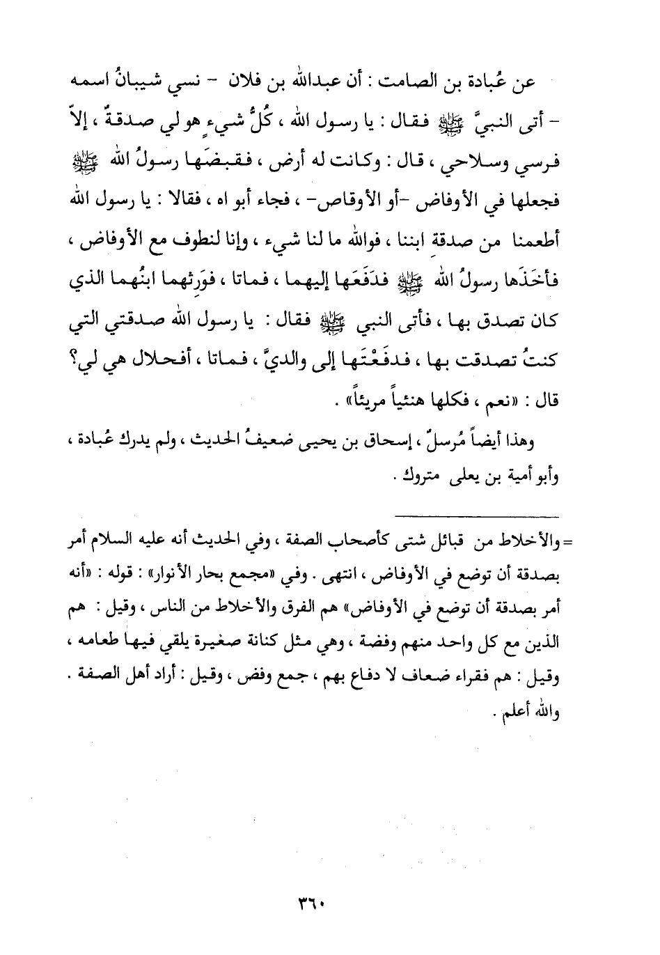 عَنْ عُبَادَةَ بْنِ الصَّامِتِ , أَنَّ عَبْدَ اللَّهِ بْنَ فُلَانٍ - نَسِيَ شَيْبَانُ اسْمَهُ - أَتَى النَّبِيَّ صَلَّى اللهُ عَلَيْهِ وَسَلَّمَ , فَقَالَ: يَا رَسُولَ اللَّهِ كُلُّ شَيْءٍ هُوَ لِي فَهُوَ صَدَقَةٌ إِلَّا فَرَسِي وَسِلَاحِي , قَالَ: وَكَانَتْ لَهُ أَرْضٌ فَقَبَضَهَا رَسُولُ اللَّهِ صَلَّى اللهُ عَلَيْهِ وَسَلَّمَ فَجَعَلَهَا فِي الْأَوْفَاضِ أَوِ الْأَوْقَاصِ , فَجَاءَ أَبَوَاهُ فَقَالَا: يَا رَسُولَ اللَّهِ أَطْعِمْنَا مِنْ صَدَقَةِ ابْنِنَا فَوَاللَّهِ مَا لَنَا شَيْءٌ وَإِنَّا لَنَطُوفُ مَعَ الْأَوْفَاضِ , فَأَخَذَهَا رَسُولُ اللَّهِ صَلَّى اللهُ عَلَيْهِ وَسَلَّمَ فَدَفَعَهَا إِلَيْهِمَا فَمَاتَا فَوَرِثَهَا ابْنُهُمَا الَّذِي كَانَ تَصَدَّقَ بِهَا , فَأَتَى النَّبِيَّ صَلَّى اللهُ عَلَيْهِ وَسَلَّمَ , فَقَالَ: يَا رَسُولَ اللَّهِ §صَدَقَتِي الَّتِي كُنْتُ تَصَدَّقْتُ بِهَا فَدَفَعْتَهَا إِلَى وَالِدِيَّ فَمَاتَا أَفَحَلَالٌ هِيَ لِي؟ , قَالَ: «نَعَمْ فَكُلْهَا هَنِيئًا مَرِيئًا». وَهَذَا أَيْضًا مُرْسَلٌ. إِسْحَاقُ بْنُ يَحْيَى ضَعِيفٌ , وَلَمْ يُدْرِكْ عُبَادَةَ , وَأَبُو أُمَيَّةَ بْنُ يَعْلَى مَتْرُوكٌ وَاللَّهُ أَعْلَمُ
