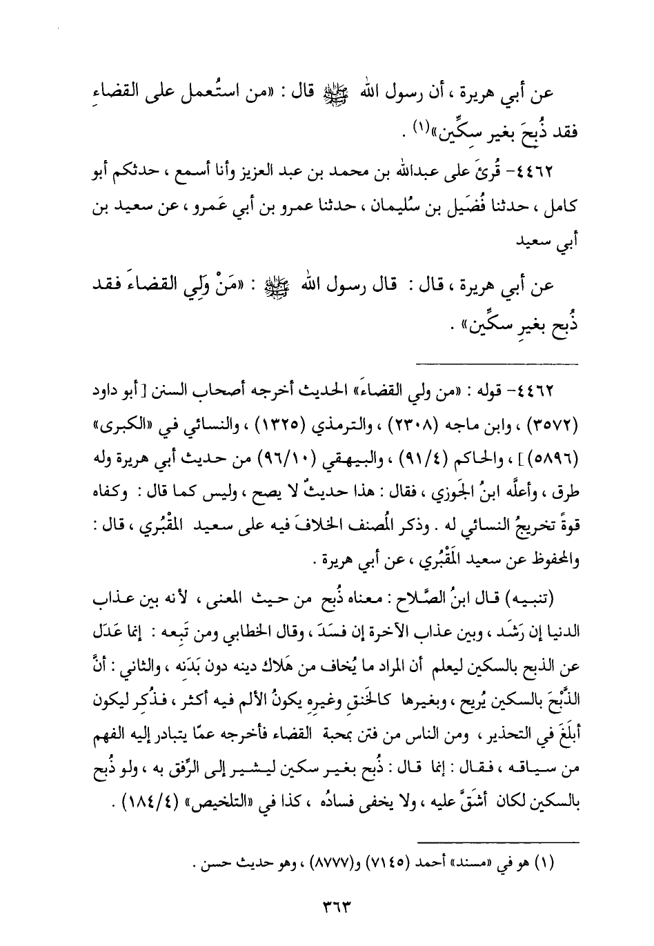 4462 - قُرِئَ عَلَى عَبْدِ اللَّهِ بْنِ مُحَمَّدٍ وَأَنَا أَسْمَعُ: حَدَّثَكُمْ أَبُو كَامِلٍ , نا فُضَيْلُ بْنُ سُلَيْمَانَ , نا عَمْرُو بْنُ أَبِي عَمْرٍو , عَنْ سَعِيدِ بْنِ أَبِي سَعِيدٍ , عَنْ أَبِي هُرَيْرَةَ , قَالَ: قَالَ رَسُولُ اللَّهِ صَلَّى اللهُ عَلَيْهِ وَسَلَّمَ: § «مَنْ وُلِّيَ الْقَضَاءَ فَقَدْ ذُبِحَ بِغَيْرِ سِكِّينٍ»