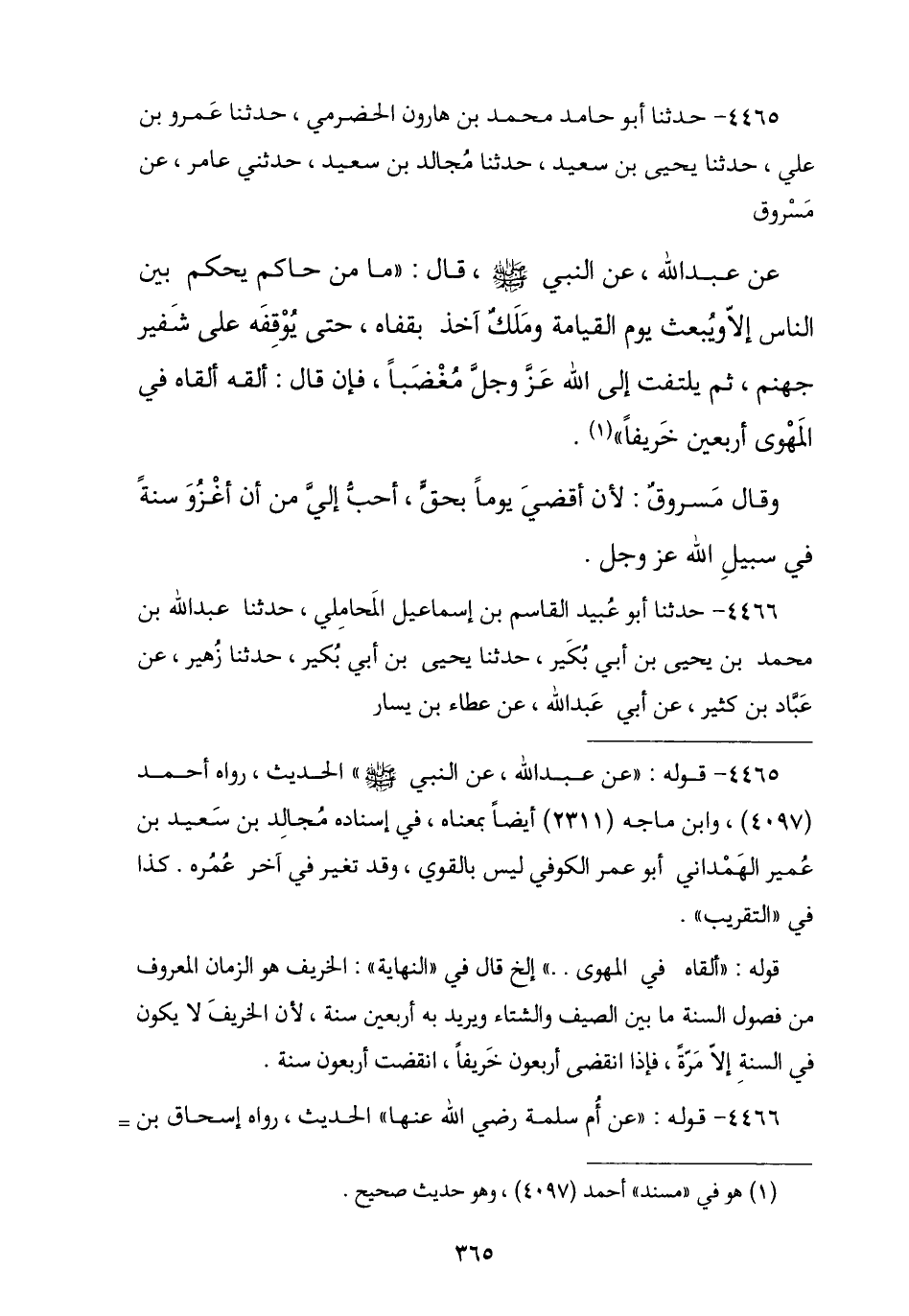 4465 - وَنا أَبُو حَامِدٍ مُحَمَّدُ بْنُ هَارُونَ الْحَضْرَمِيُّ , نا عَمْرُو بْنُ عَلِيٍّ , نا يَحْيَى بْنُ سَعِيدٍ , نا مُجَالِدُ بْنُ سَعِيدٍ , نا عَامِرٌ , عَنْ مَسْرُوقٍ , عَنْ عَبْدِ اللَّهِ , عَنِ النَّبِيِّ صَلَّى اللهُ عَلَيْهِ وَسَلَّمَ , قَالَ: " مَا مِنْ §حَاكِمٍ يَحْكُمُ بَيْنَ النَّاسِ إِلَّا يُبْعَثُ يَوْمَ الْقِيَامَةِ وَمَلَكٌ آخِذٌ بِقَفَاهُ حَتَّى يُوقِفَهُ عَلَى شَفِيرِ جَهَنَّمَ ثُمَّ يَلْتَفِتُ إِلَى اللَّهِ مُغْضَبًا , فَإِنْ قَالَ: أَلْقِهِ أَلْقَاهُ فِي الْمَهْوَى أَرْبَعِينَ خَرِيفًا ". وَقَالَ مَسْرُوقٌ: لَأَنْ أَقْضِيَ يَوْمًا بِحَقٍّ أَحَبُّ إِلَيَّ مِنْ أَنْ أَغْزُوَ سَنَةً فِي سَبِيلِ اللَّهِ عَزَّ وَجَلَّ