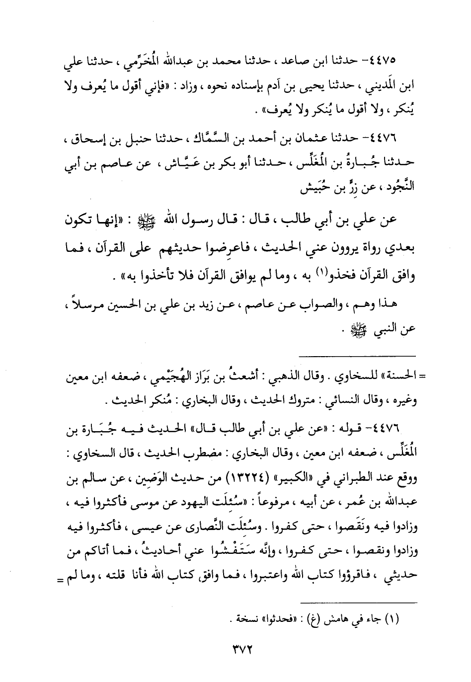 4476 - حَدَّثَنَا عُثْمَانُ بْنُ أَحْمَدَ بْنِ السَّمَّاكِ , نا حَنْبَلُ بْنُ إِسْحَاقَ , نا جُبَارَةُ بْنُ الْمُغَلِّسِ , نا أَبُو بَكْرِ بْنُ عَيَّاشٍ , عَنْ عَاصِمِ بْنِ أَبِي النَّجُودِ , عَنْ زِرِّ بْنِ حُبَيْشٍ , عَنْ عَلِيِّ بْنِ أَبِي طَالِبٍ , قَالَ: قَالَ رَسُولُ اللَّهِ صَلَّى اللهُ عَلَيْهِ وَسَلَّمَ: «إِنَّهَا تَكُونُ بَعْدِي رُوَاةٌ يَرْوُونَ عَنِّي الْحَدِيثَ , §فَاعْرِضُوا حَدِيثَهُمْ عَلَى الْقُرْآنِ فَمَا وَافَقَ الْقُرْآنَ فَخُذُوا بِهِ , وَمَا لَمْ يُوَافِقِ الْقُرْآنَ فَلَا تَأْخُذُوا بِهِ». هَذَا وَهْمٌ وَالصَّوَابُ عَنْ عَاصِمٍ , عَنْ زَيْدٍ , عَنْ عَلِيِّ بْنِ الْحُسَيْنِ , مُرْسَلًا عَنِ النَّبِيِّ صَلَّى اللهُ عَلَيْهِ وَسَلَّمَ