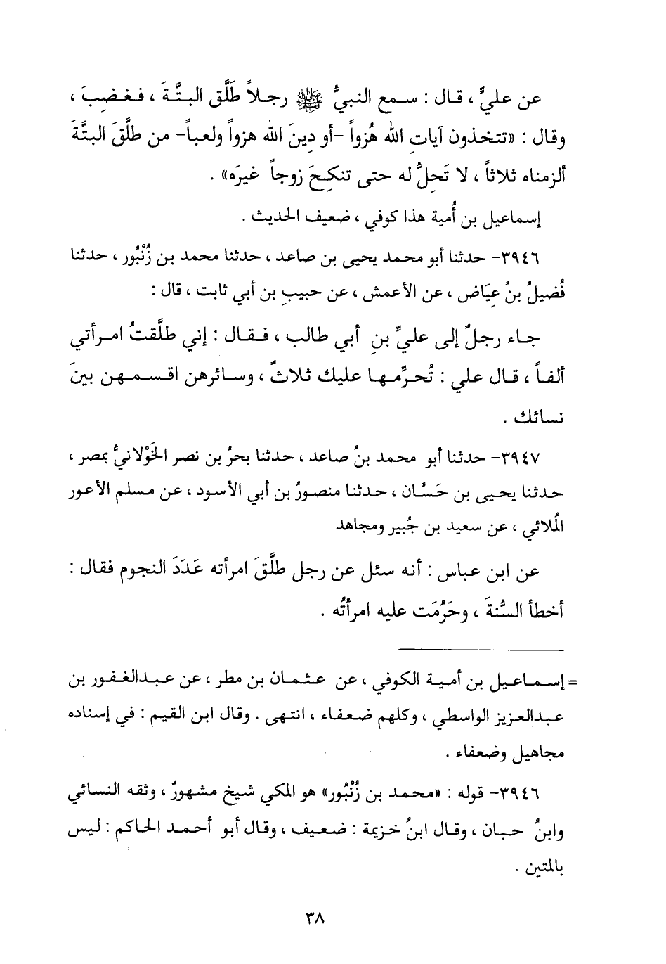3946 - نا ابْنُ صَاعِدٍ , نا مُحَمَّدُ بْنُ زُنْبُورٍ , نا فُضَيْلُ بْنُ عِيَاضٍ , عَنِ الْأَعْمَشِ , عَنْ حَبِيبِ بْنِ أَبِي ثَابِتٍ , قَالَ: جَاءَ رَجُلٌ إِلَى عَلِيِّ بْنِ أَبِي طَالِبٍ , فَقَالَ: إِنِّي طَلَّقْتُ امْرَأَتِي أَلْفًا , قَالَ عَلِيٌّ: § «يُحَرِّمُهَا عَلَيْكَ ثَلَاثٌ وَسَائِرُهُنَّ اقْسِمْهُنَّ بَيْنَ نِسَائِكَ»