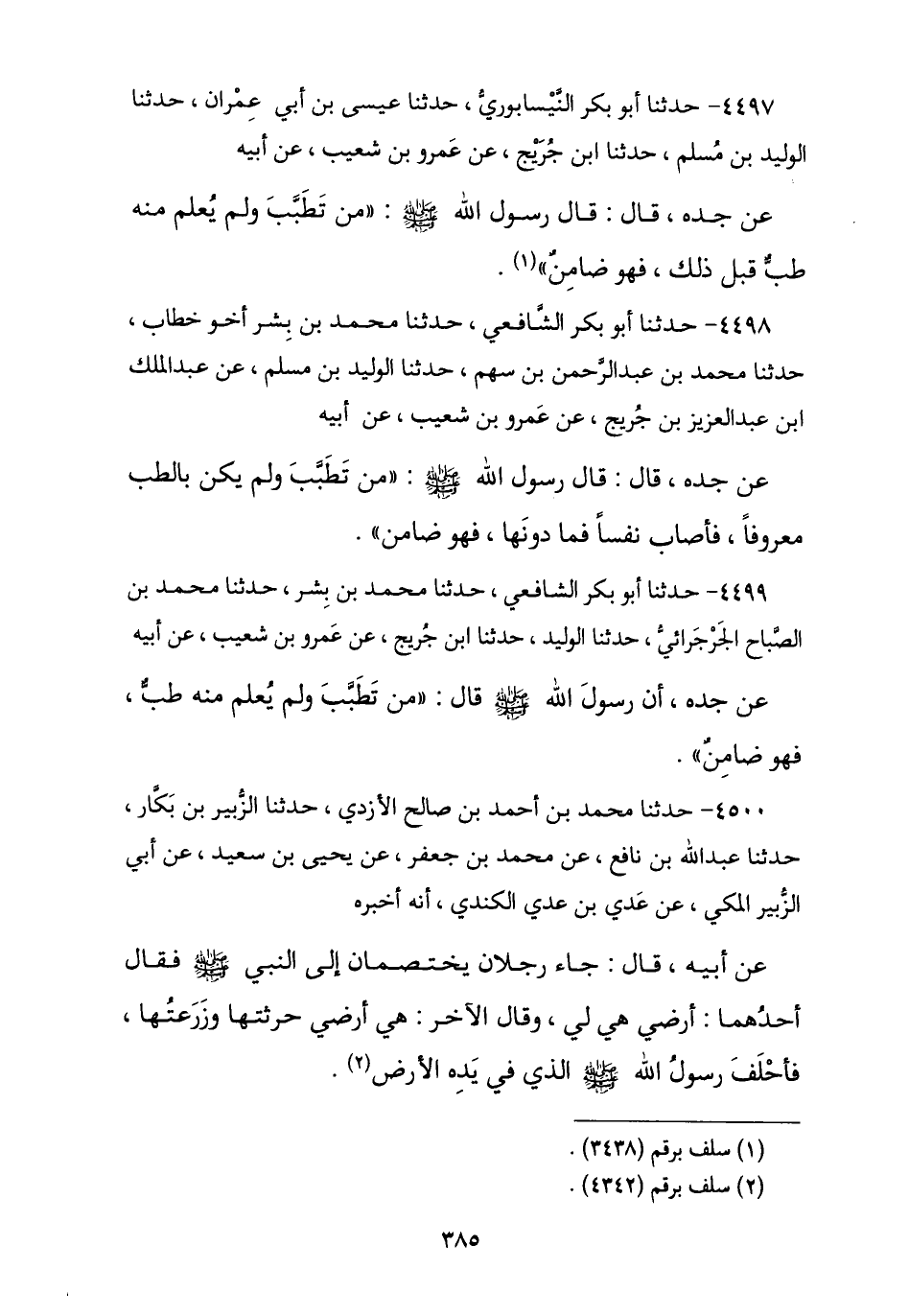 4499 - نا أَبُو بَكْرٍ الشَّافِعِيُّ , نا مُحَمَّدُ بْنُ بِشْرٍ , نا مُحَمَّدُ بْنُ الصَّبَّاحِ الْجَرْجَرَائِيُّ , نا الْوَلِيدُ , نا ابْنُ جُرَيْجٍ , عَنْ عَمْرِو بْنِ شُعَيْبٍ , عَنْ أَبِيهِ , عَنْ جَدِّهِ , أَنَّ رَسُولَ اللَّهِ صَلَّى اللهُ عَلَيْهِ وَسَلَّمَ قَالَ: § «مَنْ تَطَبَّبَ وَلَمْ يُعْلَمْ مِنْهُ طِبٌّ فَهُوَ ضَامِنٌ»
