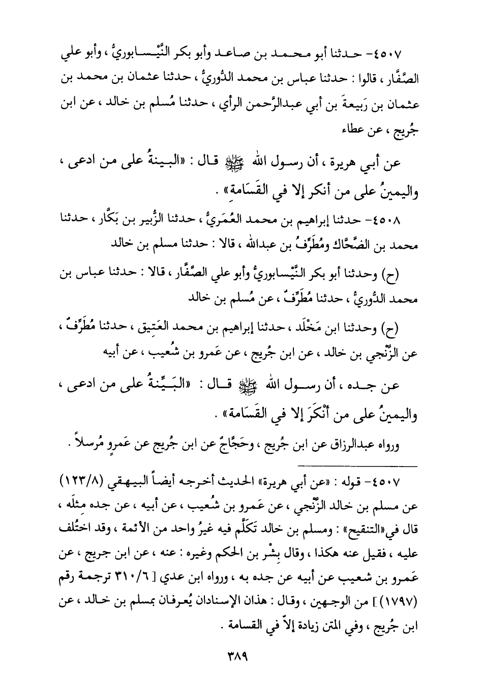4508 - نا إِبْرَاهِيمُ بْنُ مُحَمَّدٍ الْعُمَرِيُّ , نا الزُّبَيْرُ بْنُ بَكَّارٍ , نا مُحَمَّدُ بْنُ الضَّحَّاكِ , وَمُطَرِّفُ بْنُ عَبْدِ اللَّهِ , قَالَا: نا مُسْلِمُ بْنُ خَالِدٍ ح وَنا أَبُو بَكْرٍ النَّيْسَابُورِيُّ , وَأَبُو عَلِيٍّ الصَّفَّارُ , قَالَا: نا عَبَّاسُ بْنُ مُحَمَّدٍ , نا مُطَرِّفٌ , عَنْ مُسْلِمِ بْنِ خَالِدٍ ح وَنا ابْنُ مَخْلَدٍ , نا إِبْرَاهِيمُ بْنُ مُحَمَّدٍ الْعَتِيقُ , نا مُطَرِّفٌ , عَنِ الزَّنْجِيِّ بْنِ خَالِدٍ , عَنِ ابْنِ جُرَيْجٍ , عَنْ عَمْرِو بْنِ شُعَيْبٍ , عَنْ أَبِيهِ , عَنْ جَدِّهِ , أَنَّ رَسُولَ اللَّهِ صَلَّى اللهُ عَلَيْهِ وَسَلَّمَ قَالَ: § «الْبَيِّنَةُ عَلَى مَنِ ادَّعَى , وَالْيَمِينُ عَلَى مَنْ أَنْكَرَ إِلَّا فِي الْقَسَامَةِ». وَرَوَاهُ عَبْدُ الرَّزَّاقِ , عَنِ ابْنِ جُرَيْجٍ. وَحَجَّاجٌ , عَنِ ابْنِ جُرَيْجٍ , عَنْ عَمْرٍو مُرْسَلًا