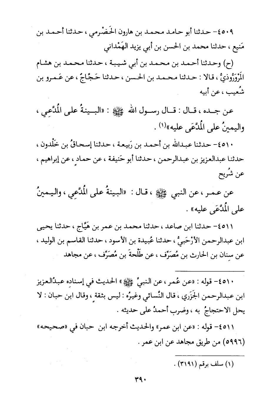 4509 - نا أَبُو حَامِدٍ بْنُ هَارُونَ , نا أَحْمَدُ بْنُ مَنِيعٍ , نا مُحَمَّدُ بْنُ الْحَسَنِ بْنِ أَبِي يَزِيدَ الْهَمْدَانِيُّ ح وَنا أَحْمَدُ بْنُ مُحَمَّدِ بْنِ أَبِي شَيْبَةَ , نا مُحَمَّدُ بْنُ هِشَامٍ الْمَرْوَرُوذِيُّ , قَالَا: نا، مُحَمَّدُ بْنُ الْحَسَنِ , نا حَجَّاجٌ , عَنْ عَمْرِو بْنِ شُعَيْبٍ , عَنْ أَبِيهِ , عَنْ جَدِّهِ , قَالَ: قَالَ رَسُولُ اللَّهِ صَلَّى اللهُ عَلَيْهِ وَسَلَّمَ: «§الْبَيِّنَةُ عَلَى مَنِ ادَّعَى، وَالْيَمِينُ عَلَى الْمُدَّعَى عَلَيْهِ»