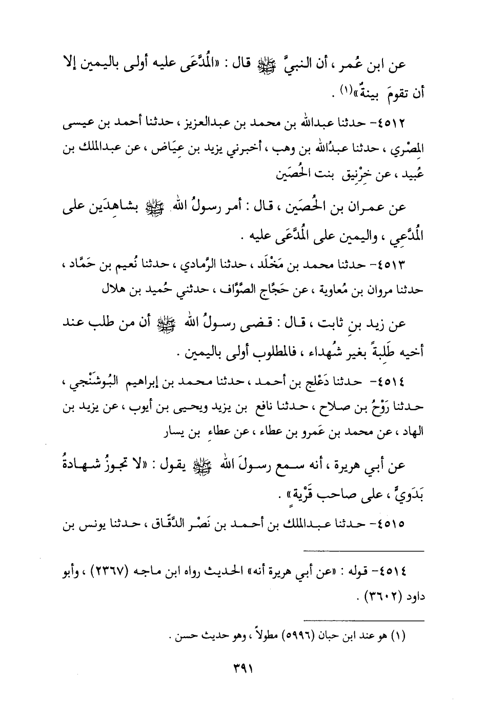 4512 - نا عَبْدُ اللَّهِ بْنُ مُحَمَّدِ بْنِ عَبْدِ الْعَزِيزِ , نا أَحْمَدُ بْنُ عِيسَى الْمِصْرِيُّ , نا عَبْدُ اللَّهِ بْنُ وَهْبٍ , أَخْبَرَنِي يَزِيدُ بْنُ عِيَاضٍ , عَنْ عَبْدِ الْمَلِكِ بْنِ عُبَيْدٍ , عَنْ خُرَيْنِقَ بِنْتِ الْحُصَيْنِ , عَنْ عِمْرَانَ بْنِ الْحُصَيْنِ , قَالَ: § «أَمَرَ رَسُولُ اللَّهِ صَلَّى اللهُ عَلَيْهِ وَسَلَّمَ بِشَاهِدَيْنِ عَلَى الْمُدَّعِي , وَالْيَمِينِ عَلَى الْمُدَّعَى عَلَيْهِ»