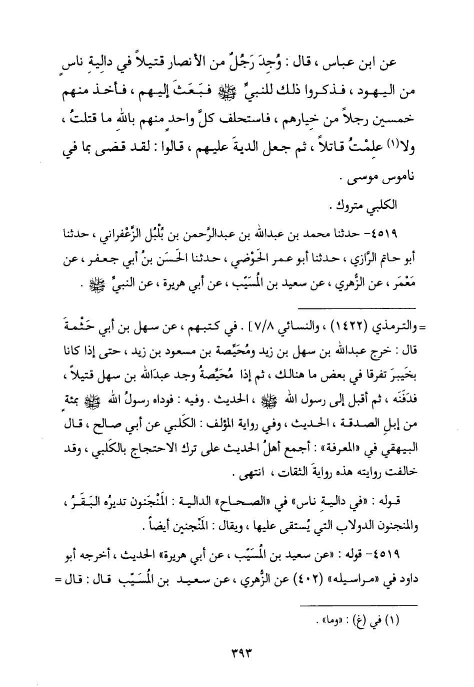 4519 - نا مُحَمَّدُ بْنُ عَبْدِ اللَّهِ بْنِ عَبْدِ الرَّحْمَنِ بْنِ بُلَيْلٍ الزَّعْفَرَانِيُّ , نا أَبُو حَاتِمٍ الرَّازِيُّ , نا أَبُو عُمَرَ الْحَوْضِيُّ , نا الْحَسَنُ بْنُ أَبِي جَعْفَرٍ , عَنْ مَعْمَرٍ , عَنِ الزُّهْرِيِّ , عَنْ سَعِيدِ بْنِ الْمُسَيِّبِ , عَنْ أَبِي هُرَيْرَةَ , عَنِ النَّبِيِّ صَلَّى اللهُ عَلَيْهِ وَسَلَّمَ. -[394]- وَنا عُثْمَانُ بْنُ عَلِيٍّ الصَّيْدَلَانِيُّ , وَهِبَةُ اللَّهِ بْنُ جَعْفَرٍ الْمُقْرِئُ , قَالَا: نا مُحَمَّدُ بْنُ يُوسُفَ بْنِ مُوسَى الْمُقْرِئُ , نا إِسْحَاقُ بْنُ أَبِي حَمْزَةَ , نا يَحْيَى بْنُ أَبِي الْخَصِيبِ , نا هَارُونُ بْنُ عَبْدِ الرَّحِيمِ , عَنْ إِبْرَاهِيمَ بْنِ أَبِي عَبْلَةَ , عَنِ الزُّهْرِيِّ , عَنْ سَعِيدِ بْنِ الْمُسَيِّبِ , عَنْ أَبِي هُرَيْرَةَ , قَالَ: قَالَ رَسُولُ اللَّهِ صَلَّى اللهُ عَلَيْهِ وَسَلَّمَ: § «حَرِيمُ الْبِئْرِ الْبَدِيِ خَمْسَةٌ وَعِشْرُونَ ذِرَاعًا , وَحَرِيمُ الْبِئْرِ الْعَادِيَّةِ خَمْسُونَ ذِرَاعًا , وَحَرِيمُ الْعَيْنِ السَّائِحَةِ ثَلَاثُمِائَةٍ ذِرَاعٍ , وَحَرِيمُ عَيْنِ الزَّرْعِ سَتُّمِائَةِ ذِرَاعٍ». لَفْظُهُمَا سَوَاءٌ الصَّحِيحُ مِنَ الْحَدِيثِ أَنَّهُ مُرْسَلٌ عَنِ ابْنِ الْمُسَيِّبِ , وَمَنْ أَسْنَدَهُ فَقَدْ وَهِمَ