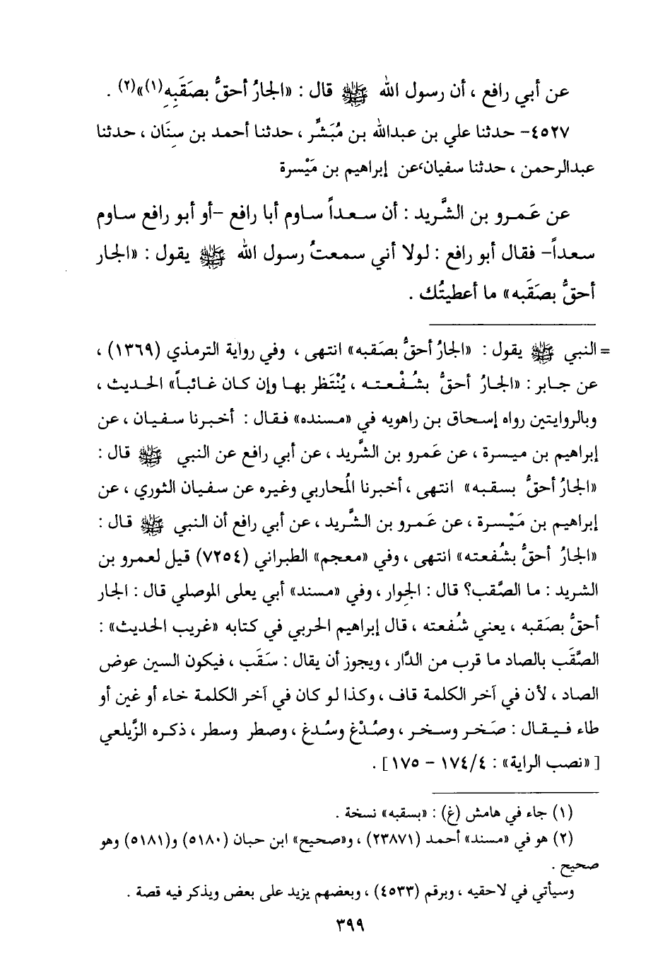 4527 - نا عَلِيُّ بْنُ عَبْدِ اللَّهِ بْنِ مُبَشِّرٍ , نا أَحْمَدُ بْنُ سِنَانٍ , نا عَبْدُ الرَّحْمَنِ , نا سُفْيَانُ , عَنْ إِبْرَاهِيمَ بْنِ مَيْسَرَةَ , عَنْ عَمْرِو بْنِ الشَّرِيدِ , أَنَّ سَعْدًا سَاوَمَ أَبَا رَافِعٍ , أَوْ أَبُو رَافِعٍ سَاوَمَ سَعْدًا , فَقَالَ أَبُو رَافِعٍ: لَوْلَا أَنِّي سَمِعْتُ رَسُولَ اللَّهِ صَلَّى اللهُ عَلَيْهِ وَسَلَّمَ يَقُولُ: § «الْجَارُ أَحَقُّ بِسَقَبِهِ» مَا أَعْطَيْتُكَ