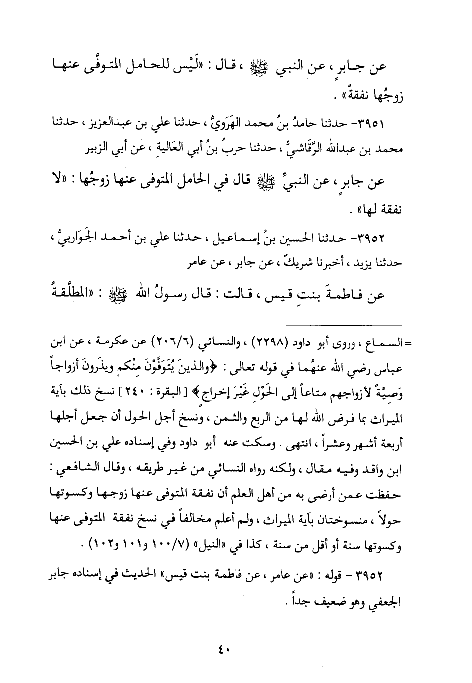 3951 - نا حَامِدُ بْنُ مُحَمَّدٍ الْهَرَوِيُّ , نا عَلِيُّ بْنُ عَبْدِ الْعَزِيزِ , نا مُحَمَّدُ بْنُ عَبْدِ اللَّهِ الرَّقَاشِيُّ , نا حَرْبُ بْنُ أَبِي الْعَالِيَةِ , عَنْ أَبِي الزُّبَيْرِ , عَنْ جَابِرٍ , عَنِ النَّبِيِّ صَلَّى اللهُ عَلَيْهِ وَسَلَّمَ قَالَ فِي §الْحَامِلِ الْمُتَوَفَّى عَنْهَا زَوْجُهَا: «لَا نَفَقَةَ لَهَا»