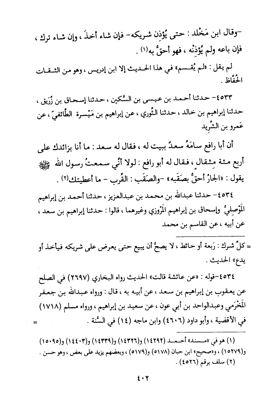 4533 - نا أَحْمَدُ بْنُ عِيسَى بْنِ السُّكَيْنِ , نا إِسْحَاقُ بْنُ رُزَيْقٍ , نا إِبْرَاهِيمُ بْنُ خَالِدٍ , نا الثَّوْرِيُّ , عَنْ إِبْرَاهِيمَ بْنِ مَيْسَرَةَ الطَّائِفِيِّ , عَنْ عَمْرِو بْنِ الشَّرِيدِ , أَنَّ أَبَا رَافِعٍ سَامَهُ سَعْدٌ بِبَيْتٍ لَهُ , فَقَالَ لَهُ سَعْدٌ: مَا أَنَا بِزَائِدِكَ عَلَى أَرْبَعِمِائَةِ مِثْقَالٍ فَقَالَ لَهُ أَبُو رَافِعٍ: لَوْلَا أَنِّي سَمِعْتُ رَسُولَ اللَّهِ صَلَّى اللهُ عَلَيْهِ وَسَلَّمَ يَقُولُ: § «الْجَارُ أَحَقُّ بِصَقَبِهِ» , وَالصَّقْبُ الْقُرْبُ , مَا أَعْطَيْتُكَ