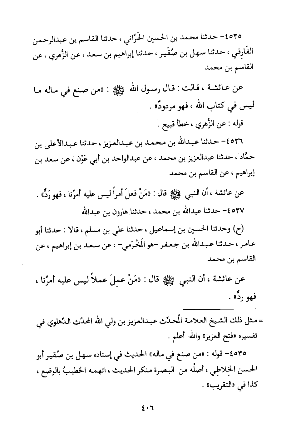 4536 - نا عَبْدُ اللَّهِ بْنُ مُحَمَّدِ بْنِ عَبْدِ الْعَزِيزِ , نا عَبْدُ الْأَعْلَى بْنُ حَمَّادٍ , نا عَبْدُ الْعَزِيزِ بْنُ مُحَمَّدٍ , عَنْ عَبْدِ الْوَاحِدِ بْنِ أَبِي عَوْنٍ , عَنْ سَعْدِ بْنِ إِبْرَاهِيمَ , عَنِ الْقَاسِمِ , عَنْ عَائِشَةَ , أَنَّ النَّبِيَّ صَلَّى اللهُ عَلَيْهِ وَسَلَّمَ , قَالَ: «مَنْ §فَعَلَ أَمْرًا لَيْسَ عَلَيْهِ أَمْرُنَا فَهُوَ مَرْدُودٌ»