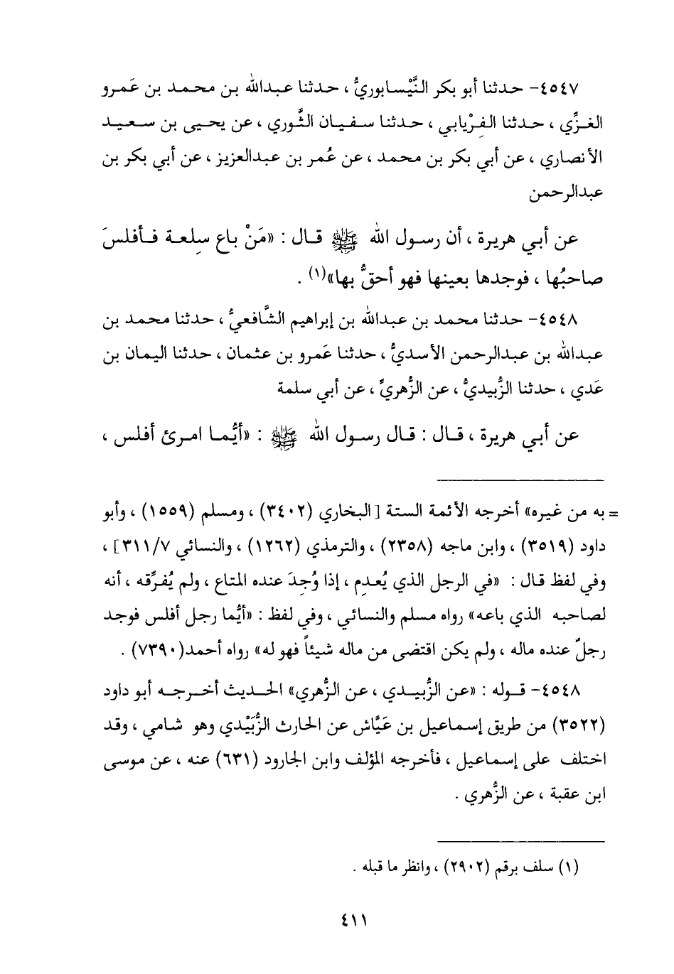 4547 - نا أَبُو بَكْرٍ النَّيْسَابُورِيُّ , نا عَبْدُ اللَّهِ بْنُ مُحَمَّدِ بْنِ عَمْرٍو الْغَزِّيُّ , نا الْفِرْيَابِيُّ , نا سُفْيَانُ الثَّوْرِيُّ , عَنْ يَحْيَى بْنِ سَعِيدٍ الْأَنْصَارِيِّ , عَنْ أَبِي بَكْرِ بْنِ مُحَمَّدٍ , عَنْ عُمَرَ بْنِ عَبْدِ الْعَزِيزِ , عَنْ أَبِي بَكْرِ بْنِ عَبْدِ الرَّحْمَنِ , عَنْ أَبِي هُرَيْرَةَ , أَنَّ رَسُولَ اللَّهِ صَلَّى اللهُ عَلَيْهِ وَسَلَّمَ , قَالَ: § «مِنْ بَاعَ سِلْعَةً فَأَفْلَسَ صَاحِبُهَا فَوَجَدَهَا بِعَيْنِهَا فَهُوَ أَحَقُّ بِهَا»