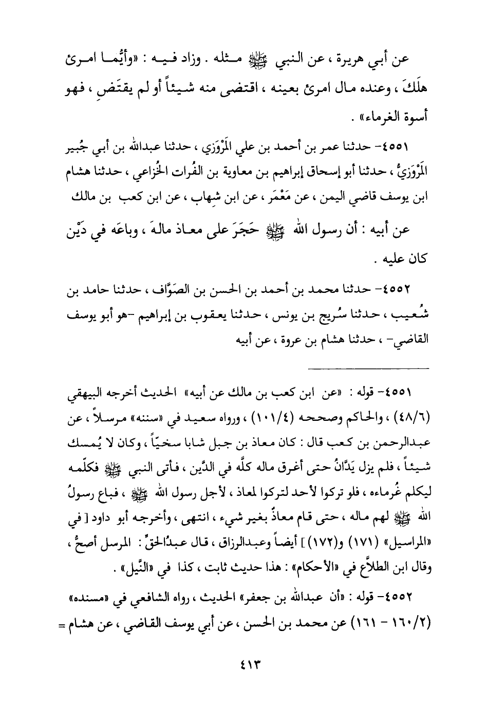 4551 - نا عُمَرُ بْنُ أَحْمَدَ بْنِ عَلِيٍّ الْمَرْوَزِيُّ , نا عَبْدُ اللَّهِ بْنُ أَبِي جُبَيْرٍ الْمَرْوَزِيُّ , نا أَبُو إِسْحَاقَ إِبْرَاهِيمُ بْنُ مُعَاوِيَةَ بْنِ الْفُرَاتِ الْخُزَاعِيُّ , نا هِشَامُ بْنُ يُوسُفَ قَاضِي الْيَمَنِ , عَنْ مَعْمَرٍ , عَنِ ابْنِ شِهَابٍ , عَنِ ابْنِ كَعْبِ بْنِ مَالِكٍ , عَنْ أَبِيهِ , أَنَّ رَسُولَ اللَّهِ صَلَّى اللهُ عَلَيْهِ وَسَلَّمَ § «حَجَرَ عَلَى مُعَاذٍ مَالَهُ وَبَاعَهُ فِي دَيْنٍ كَانَ عَلَيْهِ»